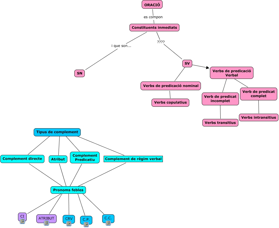 Aquest mapa conceptual conté informació relacionada amb: Sintaxi, Complement directe ???? Pronoms febles, C.C. ???? Pronoms febles, Complement Predicatiu ???? Pronoms febles, Verbs de predicació Verbal ???? Verb de predicat incomplet, ATRIBUT ???? Pronoms febles, ORACIÓ es compon Constituents inmediats, Verbs de predicació nominal ???? Verbs copulatius, Atribut ???? Tipus de complement, Complement de règim verbal ???? Tipus de complement, Constituents inmediats ???? SV, SV ???? Verbs de predicació Verbal, Verb de predicat incomplet ???? Verbs transitius, C.P. ???? Pronoms febles, Atribut ???? Pronoms febles, Complement Predicatiu ???? Tipus de complement, CI ???? Pronoms febles, CRV ???? Pronoms febles, Verb de predicat complet ???? Verbs intransitius, Verbs de predicació Verbal ???? Verb de predicat complet, Tipus de complement ???? Complement directe