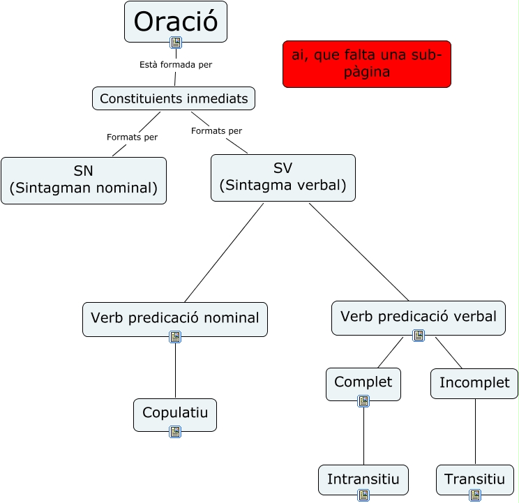 Aquest mapa conceptual conté informació relacionada amb: Esquema, Verb predicació nominal ???? Copulatiu, Verb predicació verbal ???? Complet, Complet ???? Intransitiu, SV (Sintagma verbal) ???? Verb predicació verbal, Verb predicació verbal ???? Incomplet, Oració Està formada per Constituients inmediats, Constituients inmediats Formats per SV (Sintagma verbal), SV (Sintagma verbal) ???? Verb predicació nominal, Verb predicació verbal ???? Transitiu, Constituients inmediats Formats per SN (Sintagman nominal)
