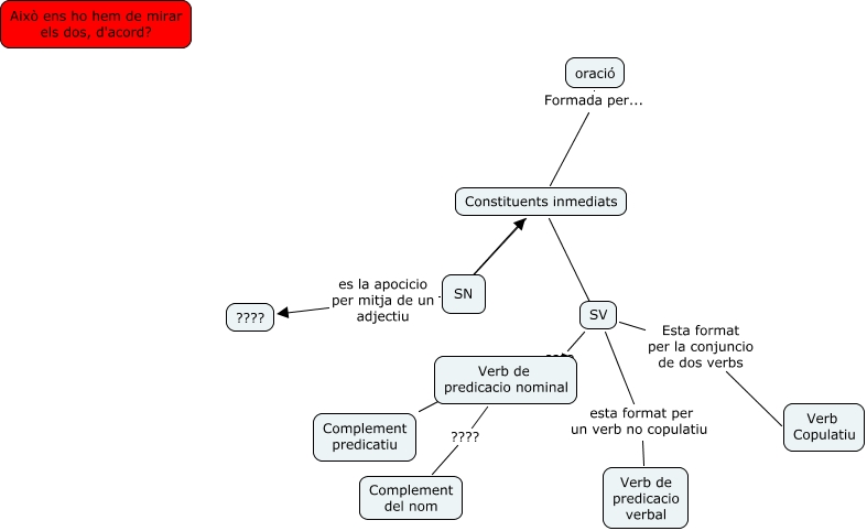 Aquest mapa conceptual conté informació relacionada amb: sintaxi, SV Esta format per la conjuncio de dos verbs Verb Copulatiu, Verb de predicacio nominal ???? Complement predicatiu, SV esta format per un verb no copulatiu Verb de predicacio verbal, SV ???? Verb de predicacio nominal, SN ???? Constituents inmediats, Verb de predicacio nominal ???? Complement del nom, Constituents inmediats ???? SN, Constituents inmediats ???? SV, oració Formada per... Constituents inmediats, SN es la apocicio per mitja de un adjectiu ????