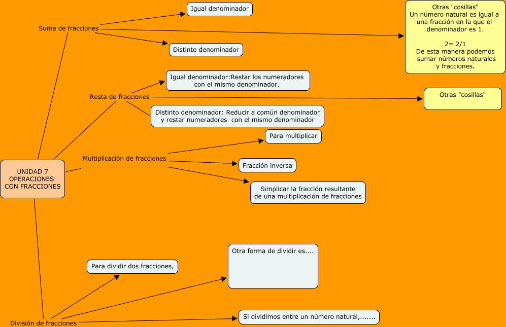 Este Cmap, tiene información relacionada con: UNIDAD 7 MATEMÁTICAS 1112, UNIDAD 7 OPERACIONES CON FRACCIONES Suma de fracciones Igual denominador, UNIDAD 7 OPERACIONES CON FRACCIONES División de fracciones Para dividir dos fracciones,, UNIDAD 7 OPERACIONES CON FRACCIONES Resta de fracciones Igual denominador:Restar los numeradores con el mismo denominador., UNIDAD 7 OPERACIONES CON FRACCIONES Multiplicación de fracciones Fracción inversa, UNIDAD 7 OPERACIONES CON FRACCIONES Suma de fracciones Otras "cosillas" Un número natural es igual a una fracción en la que el denominador es 1. 2= 2/1 De esta manera podemos sumar números naturales y fracciones., UNIDAD 7 OPERACIONES CON FRACCIONES Resta de fracciones Distinto denominador: Reducir a común denominador y restar numeradores con el mismo denominador, UNIDAD 7 OPERACIONES CON FRACCIONES Suma de fracciones Distinto denominador, UNIDAD 7 OPERACIONES CON FRACCIONES División de fracciones Si dividimos entre un número natural,......., UNIDAD 7 OPERACIONES CON FRACCIONES Multiplicación de fracciones Para multiplicar, UNIDAD 7 OPERACIONES CON FRACCIONES División de fracciones Otra forma de dividir es...., UNIDAD 7 OPERACIONES CON FRACCIONES Multiplicación de fracciones Simplicar la fracción resultante de una multiplicación de fracciones, UNIDAD 7 OPERACIONES CON FRACCIONES Resta de fracciones Otras "cosillas"