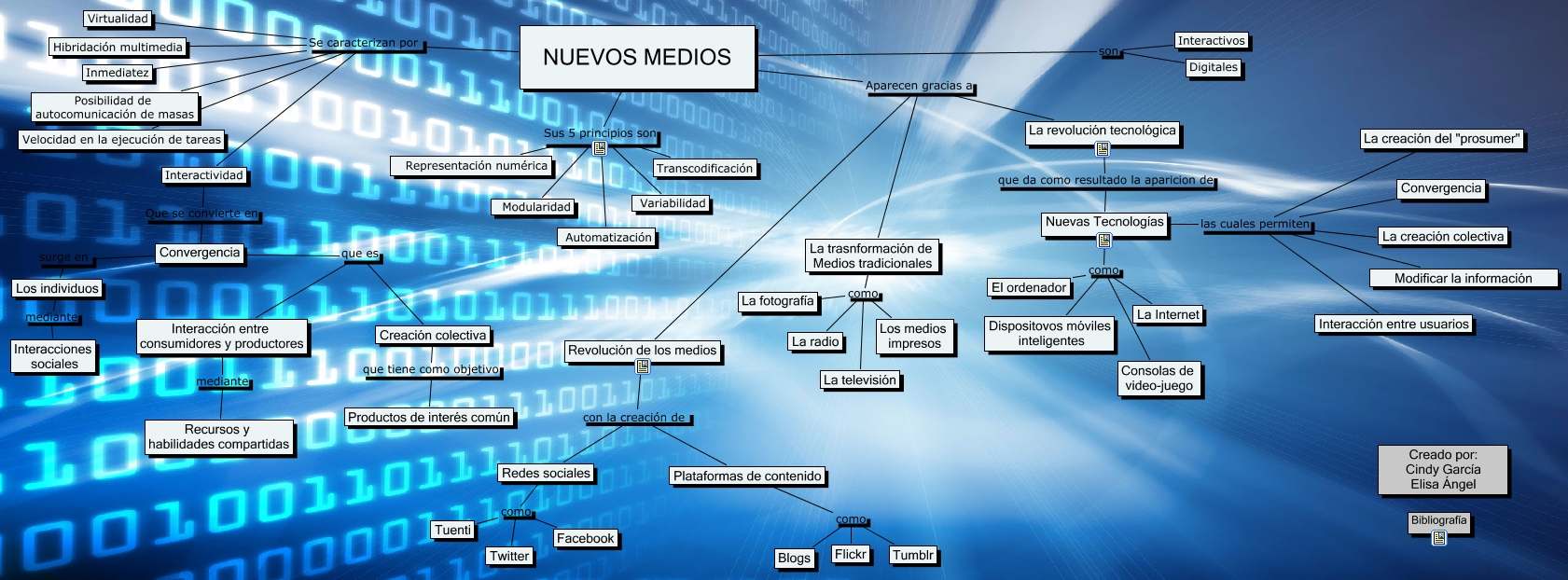 Este Cmap, tiene información relacionada con: Mapa Nuevos Medios, La trasnformación de Medios tradicionales como La televisión, La trasnformación de Medios tradicionales como La fotografía, NUEVOS MEDIOS Se caracterizan por Inmediatez, NUEVOS MEDIOS Se caracterizan por Interactividad, Nuevas Tecnologías las cuales permiten La creación del "prosumer", NUEVOS MEDIOS Sus 5 principios son Modularidad, Revolución de los medios Aparecen gracias a La trasnformación de Medios tradicionales, NUEVOS MEDIOS Aparecen gracias a La trasnformación de Medios tradicionales, Plataformas de contenido como Blogs, La trasnformación de Medios tradicionales como Los medios impresos, NUEVOS MEDIOS Se caracterizan por Virtualidad, NUEVOS MEDIOS son Digitales, Creación colectiva que tiene como objetivo Productos de interés común, La trasnformación de Medios tradicionales como La radio, Nuevas Tecnologías como El ordenador, NUEVOS MEDIOS Sus 5 principios son Representación numérica, Plataformas de contenido como Flickr, NUEVOS MEDIOS Se caracterizan por Posibilidad de autocomunicación de masas, Revolución de los medios con la creación de Redes sociales, Convergencia que es Creación colectiva