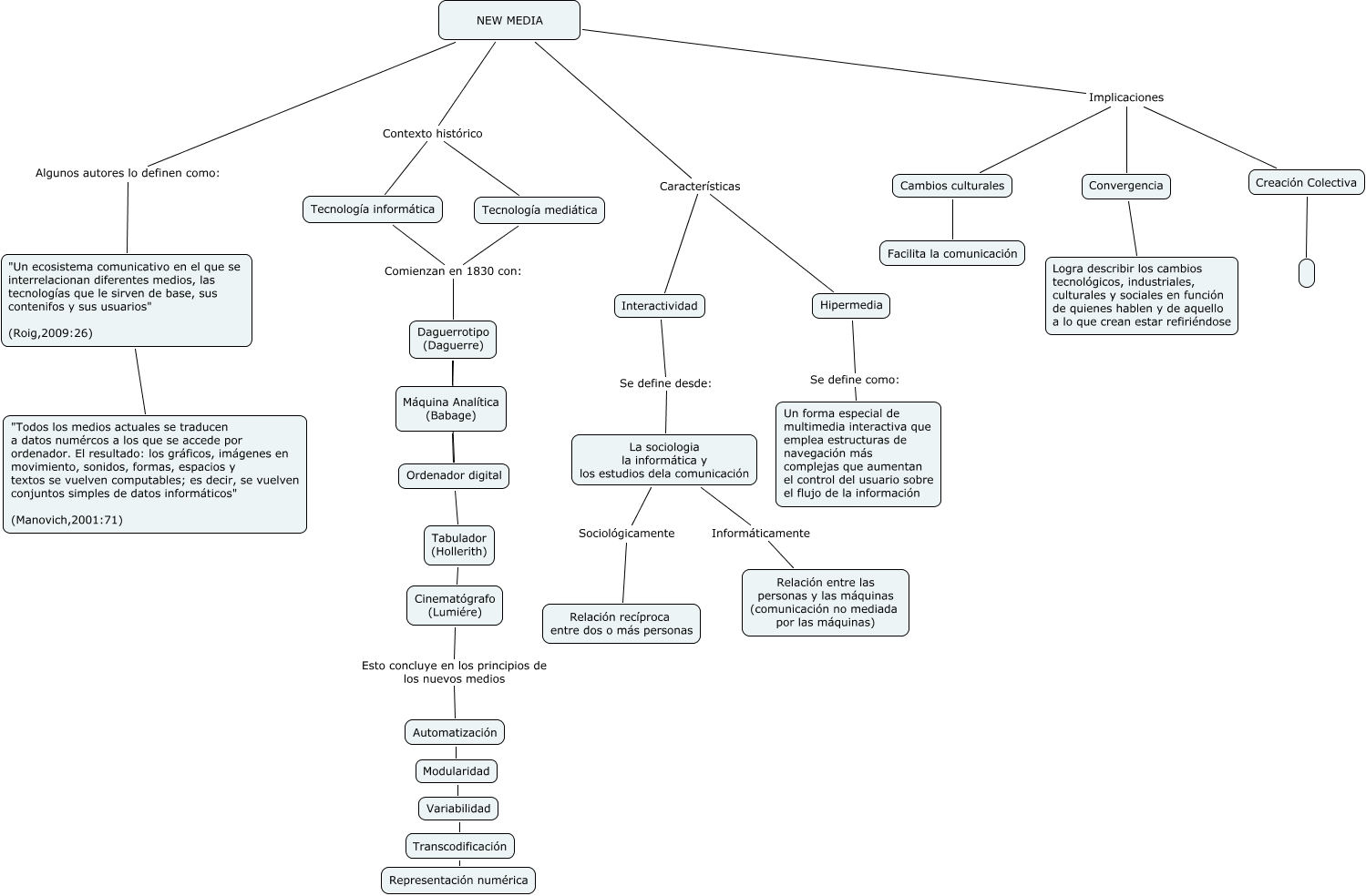 Este Cmap, tiene información relacionada con: NEW MEDIA, Cinematógrafo (Lumiére) Esto concluye en los principios de los nuevos medios Automatización, Tecnología informática Comienzan en 1830 con: Daguerrotipo (Daguerre), "Un ecosistema comunicativo en el que se interrelacionan diferentes medios, las tecnologías que le sirven de base, sus contenifos y sus usuarios" (Roig,2009:26) "Todos los medios actuales se traducen a datos numércos a los que se accede por ordenador. El resultado: los gráficos, imágenes en movimiento, sonidos, formas, espacios y textos se vuelven computables; es decir, se vuelven conjuntos simples de datos informáticos" (Manovich,2001:71), Tecnología mediática Comienzan en 1830 con: Daguerrotipo (Daguerre), La sociologia la informática y los estudios dela comunicación Informáticamente Relación entre las personas y las máquinas (comunicación no mediada por las máquinas), Máquina Analítica (Babage) Ordenador digital, Creación Colectiva, Modularidad Variabilidad, Daguerrotipo (Daguerre) ???? Ordenador digital, NEW MEDIA Implicaciones Creación Colectiva, La sociologia la informática y los estudios dela comunicación Sociológicamente Relación recíproca entre dos o más personas, Automatización Modularidad, NEW MEDIA Contexto histórico Tecnología informática, Convergencia Logra describir los cambios tecnológicos, industriales, culturales y sociales en función de quienes hablen y de aquello a lo que crean estar refiriéndose, NEW MEDIA Contexto histórico Tecnología mediática, Tabulador (Hollerith) Cinematógrafo (Lumiére), Cambios culturales Facilita la comunicación, NEW MEDIA Características Hipermedia, Hipermedia Se define como: Un forma especial de multimedia interactiva que emplea estructuras de navegación más complejas que aumentan el control del usuario sobre el flujo de la información, NEW MEDIA Algunos autores lo definen como: "Un ecosistema comunicativo en el que se interrelacionan diferentes medios, las tecnologías que le sirven de base, sus contenifos y sus usuarios" (Roig,2009:26)