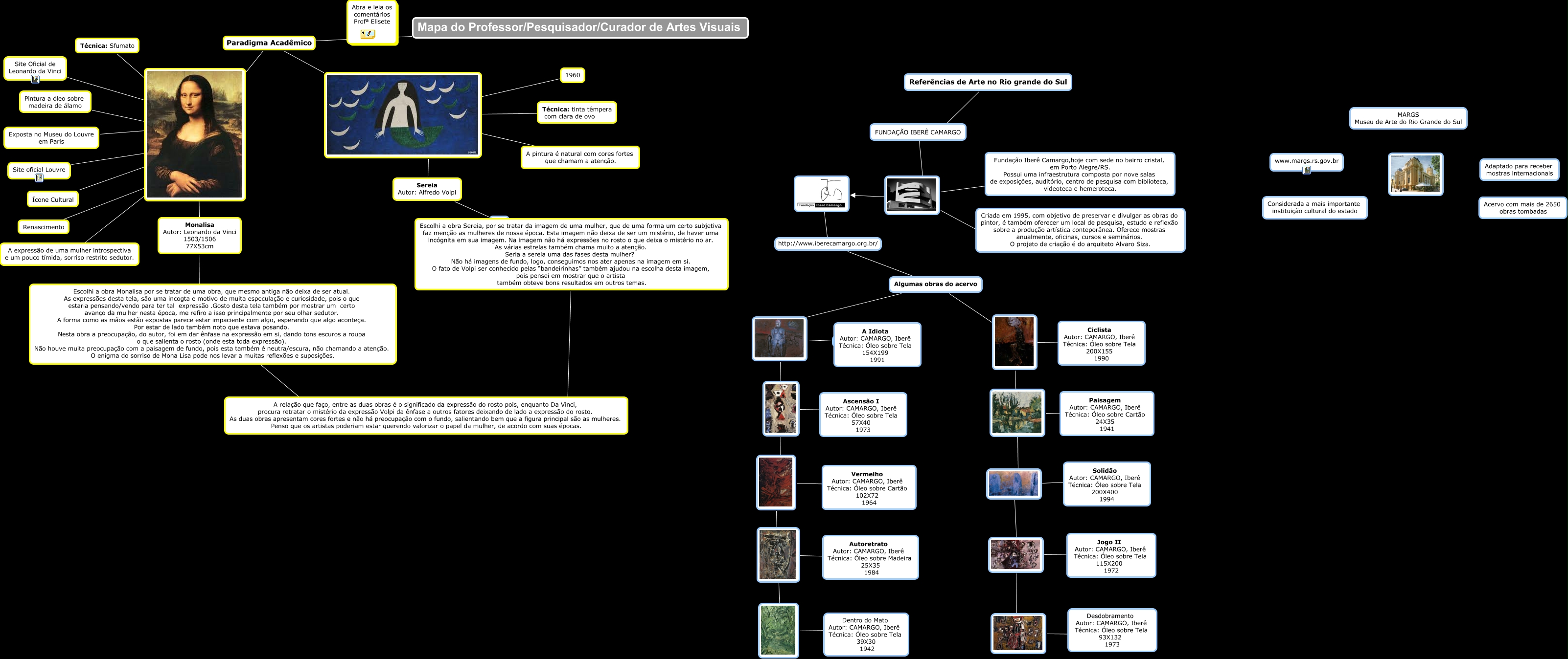 Esse mapa conceitual, produzido no IHMC CmapTools, tem a informação relacionada a: Mapa do professor Pesquisador em Artes Visuais (2012), ????, FUNDAÇÃO IBERÊ CAMARGO ????, ???? 1960, ????, Escolhi a obra Sereia, por se tratar da imagem de uma mulher, que de uma forma um certo subjetiva faz menção as mulheres de nossa época. Esta imagem não deixa de ser um mistério, de haver uma incógnita em sua imagem. Na imagem não há expressões no rosto o que deixa o mistério no ar. As várias estrelas também chama muito a atenção. Seria a sereia uma das fases desta mulher? Não há imagens de fundo, logo, conseguimos nos ater apenas na imagem em si. O fato de Volpi ser conhecido pelas “bandeirinhas” também ajudou na escolha desta imagem, pois pensei em mostrar que o artista também obteve bons resultados em outros temas. ???? A relação que faço, entre as duas obras é o significado da expressão do rosto pois, enquanto Da Vinci, procura retratar o mistério da expressão Volpi da ênfase a outros fatores deixando de lado a expressão do rosto. As duas obras apresentam cores fortes e não há preocupação com o fundo, salientando bem que a figura principal são as mulheres. Penso que os artistas poderiam estar querendo valorizar o papel da mulher, de acordo com suas épocas., ????, Algumas obras do acervo ????, ???? Fundação Iberê Camargo,hoje com sede no bairro cristal, em Porto Alegre/RS. Possui uma infraestrutura composta por nove salas de exposições, auditório, centro de pesquisa com biblioteca, videoteca e hemeroteca., ???? Monalisa Autor: Leonardo da Vinci 1503/1506 77X53cm, ???? Sereia Autor: Alfredo Volpi, Site oficial Louvre ????, ???? Solidão Autor: CAMARGO, Iberê Técnica: Óleo sobre Tela 200X400 1994, Mapa do Professor/Pesquisador/Curador de Artes Visuais Paradigma Acadêmico, ???? Vermelho Autor: CAMARGO, Iberê Técnica: Óleo sobre Cartão 102X72 1964, ???? A Idiota Autor: CAMARGO, Iberê Técnica: Óleo sobre Tela 154X199 1991, A expressão de uma mulher introspectiva e um pouco tímida, sorriso restrito sedutor. ????, ????, Site Oficial de Leonardo da Vinci ????, Exposta no Museu do Louvre em Paris ????, Sereia Autor: Alfredo Volpi ???? Escolhi a obra Sereia, por se tratar da imagem de uma mulher, que de uma forma um certo subjetiva faz menção as mulheres de nossa época. Esta imagem não deixa de ser um mistério, de haver uma incógnita em sua imagem. Na imagem não há expressões no rosto o que deixa o mistério no ar. As várias estrelas também chama muito a atenção. Seria a sereia uma das fases desta mulher? Não há imagens de fundo, logo, conseguimos nos ater apenas na imagem em si. O fato de Volpi ser conhecido pelas “bandeirinhas” também ajudou na escolha desta imagem, pois pensei em mostrar que o artista também obteve bons resultados em outros temas.