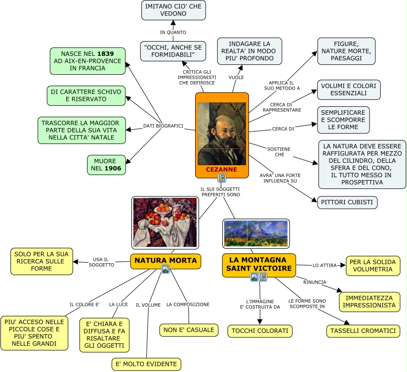 Questa Cmap, creata con IHMC CmapTools, contiene informazioni relative a: CEZANNE, NATURA MORTA LA LUCE E' CHIARA E DIFFUSA E FA RISALTARE GLI OGGETTI, CEZANNE DATI BIOGRAFICI TRASCORRE LA MAGGIOR PARTE DELLA SUA VITA NELLA CITTA' NATALE, CEZANNE CERCA DI RAPPRESENTARE VOLUMI E COLORI ESSENZIALI, LA MONTAGNA SAINT VICTOIRE RINUNCIA IMMEDIATEZZA IMPRESSIONISTA, LA MONTAGNA SAINT VICTOIRE LE FORME SONO SCOMPOSTE IN TASSELLI CROMATICI, CEZANNE AVRA' UNA FORTE INFLUENZA SU PITTORI CUBISTI, CEZANNE APPLICA IL SUO METODO A FIGURE, NATURE MORTE, PAESAGGI, CEZANNE DATI BIOGRAFICI DI CARATTERE SCHIVO E RISERVATO, NATURA MORTA USA IL SOGGETTO SOLO PER LA SUA RICERCA SULLE FORME, NATURA MORTA IL VOLUME E' MOLTO EVIDENTE, CEZANNE DATI BIOGRAFICI NASCE NEL 1839 AD AIX-EN-PROVENCE IN FRANCIA, CEZANNE DATI BIOGRAFICI MUORE NEL 1906, CEZANNE IL SUI SOGGETTI PREFERITI SONO LA MONTAGNA SAINT VICTOIRE, CEZANNE SOSTIENE CHE LA NATURA DEVE ESSERE RAFFIGURATA PER MEZZO DEL CILINDRO, DELLA SFERA E DEL CONO, IL TUTTO MESSO IN PROSPETTIVA, LA MONTAGNA SAINT VICTOIRE LO ATTIRA PER LA SOLIDA VOLUMETRIA, LA MONTAGNA SAINT VICTOIRE L'IMMAGINE E' COSTRUITA DA TOCCHI COLORATI, NATURA MORTA IL COLORE E' PIU' ACCESO NELLE PICCOLE COSE E PIU' SPENTO NELLE GRANDI, CEZANNE IL SUI SOGGETTI PREFERITI SONO NATURA MORTA, NATURA MORTA LA COMPOSIZIONE NON E' CASUALE, CEZANNE CRITICA GLI IMPRESSIONISTI CHE DEFINISCE "OCCHI, ANCHE SE FORMIDABILI"