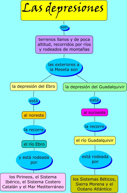 Este Cmap, tiene información relacionada con: Las depresiones, al noreste la recorre el río Ebro, el río Guadalquivir está rodeada por los Sistemas Béticos, Sierra Morena y el Océano Atlántico, Las depresiones son terrenos llanos y de poca altitud, recorridos por ríos y rodeados de montañas, terrenos llanos y de poca altitud, recorridos por ríos y rodeados de montañas las exteriores a la Meseta son la depresión del Guadalquivir, al suroeste la recorre el río Guadalquivir, terrenos llanos y de poca altitud, recorridos por ríos y rodeados de montañas las exteriores a la Meseta son la depresión del Ebro, la depresión del Ebro está al noreste, el río Ebro y está rodeada por los Pirineos, el Sistema Ibérico, el Sistema Costero Catalán y el Mar Mediterráneo, la depresión del Guadalquivir está al suroeste