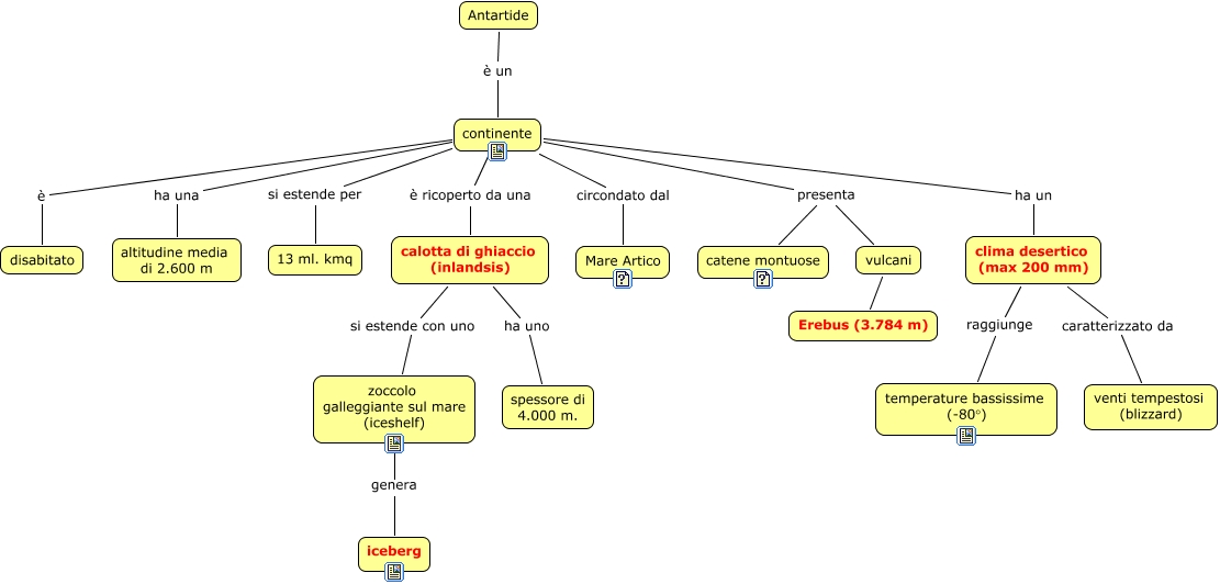 Questa Cmap, creata con IHMC CmapTools, contiene informazioni relative a: Antartide - GEO, calotta di ghiaccio (inlandsis) ha uno spessore di 4.000 m., calotta di ghiaccio (inlandsis) si estende con uno zoccolo galleggiante sul mare (iceshelf), Antartide è un continente, vulcani Erebus (3.784 m), continente ha un clima desertico (max 200 mm), zoccolo galleggiante sul mare (iceshelf) genera iceberg, continente si estende per 13 ml. kmq, clima desertico (max 200 mm) caratterizzato da venti tempestosi (blizzard), continente ha una altitudine media di 2.600 m, continente circondato dal Mare Artico, continente è disabitato, continente presenta catene montuose, clima desertico (max 200 mm) raggiunge temperature bassissime (-80°), continente è ricoperto da una calotta di ghiaccio (inlandsis), continente presenta vulcani