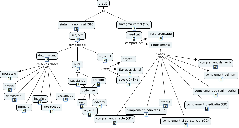 Aquest mapa conceptual conté informació relacionada amb: sintaxi, oració té sintagma verbal (SV), poden ser ???? adjectiu, complements clases complement directe (CD), complements clases complement indirecte (CI), nucli son pronom, complements clases complement circunstancial (CC), complements clases complement predicatiu (CP), determinant les seves clases demostratiu, determinant les seves clases article, determinant les seves clases interrogatiu, sintagma verbal (SV) ???? predicat, predicat compost per complements, subjecte compost per determinant, substantiu ???? poden ser, determinant les seves clases exclamatiu, complements clases complement del nom, oració té sintagma nominal (SN), adjacent clases S.preposicional, poden ser ???? verb, adjacent clases adjectiu