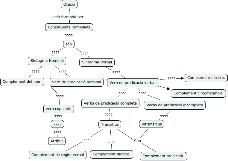 Aquest mapa conceptual conté informació relacionada amb: sintaxis, Transitius ???? Complement directe., Verb de predicació verbal. ???? Complement directe., Transitius ???? Complement de regim verbal, són ???? Sintagma Verbal, Verbs de predicació completa ???? Transitius, Constituents immediats ???? són, Sintagma Verbal ???? Verb de predicació verbal., Verb de predicació verbal. ???? Complement circumstancial, Sintagma Nominal ???? Verb de predicació nominal, Sintagma Nominal ???? Complement del nom, Verb de predicació verbal. ???? Verbs de predicació completa, Verb de predicació nominal ???? verb copulatiu, verb copulatiu ???? ????, Transitius Són Complement predicatiu, són ???? Sintagma Nominal, ???? ???? Atribut, Verbs de predicació incompleta ???? intransitius, Verb de predicació verbal. ???? Verbs de predicació incompleta, intransitius Són Complement predicatiu, Oració està formada per... Constituents immediats