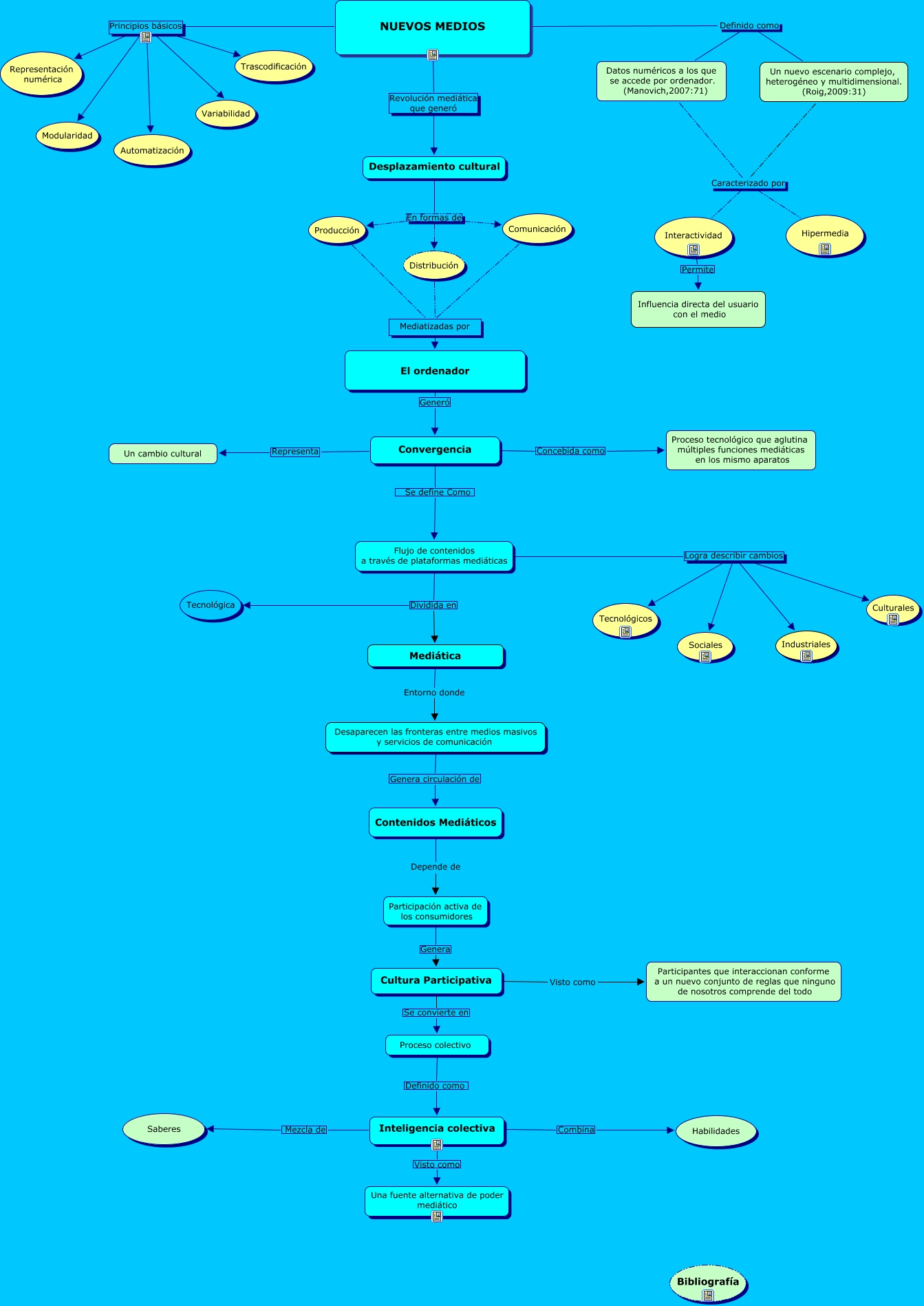 Este Cmap, tiene información relacionada con: Nuevos media, Datos numéricos a los que se accede por ordenador. (Manovich,2007:71) Caracterizado por Hipermedia, Flujo de contenidos a través de plataformas mediáticas Logra describir cambios Culturales, Datos numéricos a los que se accede por ordenador. (Manovich,2007:71) Caracterizado por Interactividad, Flujo de contenidos a través de plataformas mediáticas Logra describir cambios Sociales, Proceso colectivo Definido como Inteligencia colectiva, Flujo de contenidos a través de plataformas mediáticas Logra describir cambios Industriales, Cultura Participativa Se convierte en Proceso colectivo, Flujo de contenidos a través de plataformas mediáticas Dividida en Mediática, Interactividad Permite Influencia directa del usuario con el medio, Inteligencia colectiva Mezcla de Saberes, Contenidos Mediáticos Depende de Participación activa de los consumidores, Participación activa de los consumidores Genera Cultura Participativa, NUEVOS MEDIOS Principios básicos Representación numérica, Cultura Participativa Visto como Participantes que interaccionan conforme a un nuevo conjunto de reglas que ninguno de nosotros comprende del todo, NUEVOS MEDIOS Principios básicos Trascodificación, Producción Mediatizadas por El ordenador, NUEVOS MEDIOS Definido como Un nuevo escenario complejo, heterogéneo y multidimensional. (Roig,2009:31), NUEVOS MEDIOS Definido como Datos numéricos a los que se accede por ordenador. (Manovich,2007:71), Convergencia Se define Como Flujo de contenidos a través de plataformas mediáticas, Un nuevo escenario complejo, heterogéneo y multidimensional. (Roig,2009:31) Caracterizado por Hipermedia