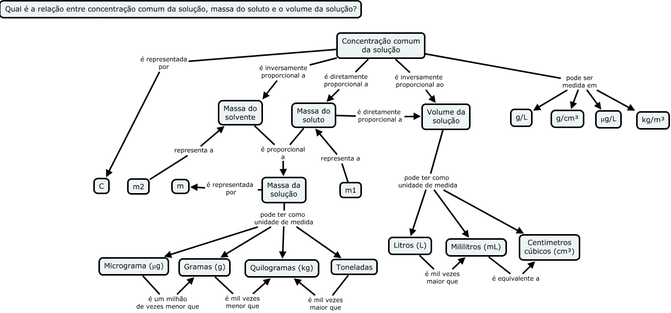 Esse mapa conceitual, produzido no IHMC CmapTools, tem a informação relacionada a: Concentração comum-2D, Concentração comum da solução pode ser medida em μg/L, Concentração comum da solução pode ser medida em g/cm³, Concentração comum da solução pode ser medida em g/L, Concentração comum da solução é inversamente proporcional a Massa do solvente, Massa da solução pode ter como unidade de medida Toneladas, m1 representa a Massa do soluto, Concentração comum da solução é inversamente proporcional ao Volume da solução, Volume da solução pode ter como unidade de medida Mililitros (mL), m2 representa a Massa do solvente, Litros (L) é mil vezes maior que Mililitros (mL), Mililitros (mL) é equivalente a Centimetros cúbicos (cm³), Concentração comum da solução é diretamente proporcional a Massa do soluto, Volume da solução pode ter como unidade de medida Centimetros cúbicos (cm³), Concentração comum da solução pode ser medida em kg/m³, Massa da solução pode ter como unidade de medida Micrograma (μg), Massa da solução pode ter como unidade de medida Gramas (g), Volume da solução pode ter como unidade de medida Litros (L), Massa do soluto é diretamente proporcional a Volume da solução, Concentração comum da solução é representada por C, Massa da solução pode ter como unidade de medida Quilogramas (kg)