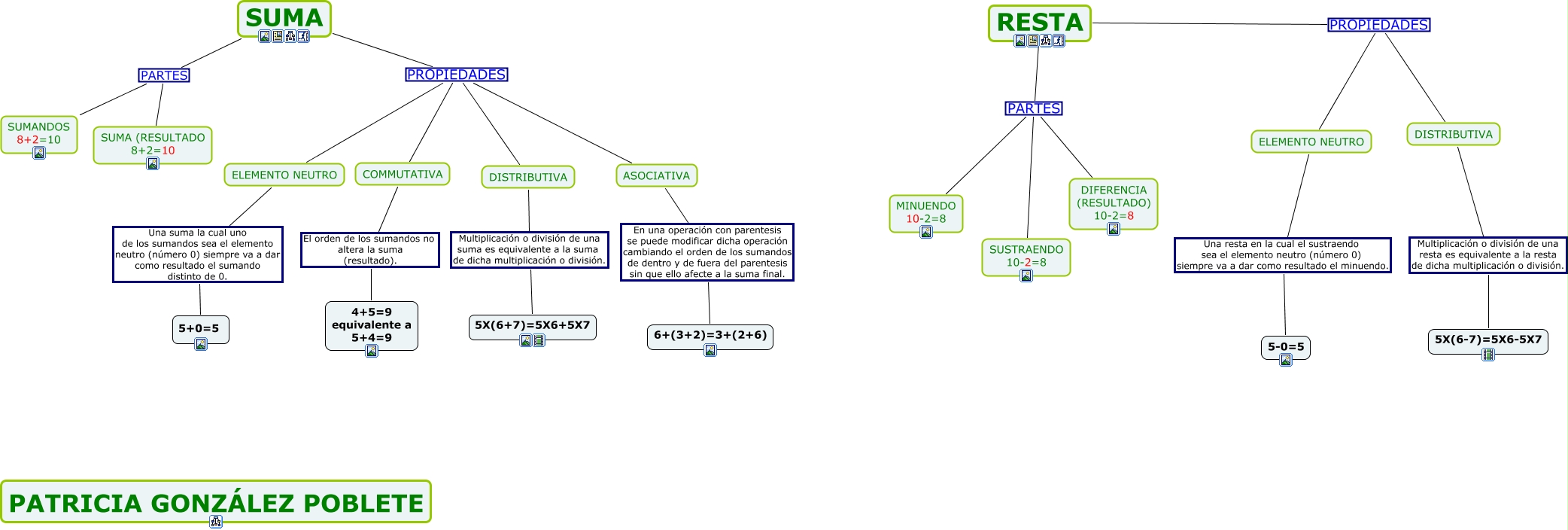 Este Cmap, tiene información relacionada con: PATRICIA MAPA CONCEPTUAL MATES 1.cmap, ELEMENTO NEUTRO Una suma la cual uno de los sumandos sea el elemento neutro (número 0) siempre va a dar como resultado el sumando distinto de 0. 5+0=5, DISTRIBUTIVA Multiplicación o división de una resta es equivalente a la resta de dicha multiplicación o división. 5X(6-7)=5X6-5X7, RESTA PARTES DIFERENCIA (RESULTADO) 10-2=8, COMMUTATIVA El orden de los sumandos no altera la suma (resultado). 4+5=9 equivalente a 5+4=9, SUMA PARTES SUMANDOS 8+2=10, SUMA PROPIEDADES ASOCIATIVA, DISTRIBUTIVA Multiplicación o división de una suma es equivalente a la suma de dicha multiplicación o división. 5X(6+7)=5X6+5X7, RESTA PARTES MINUENDO 10-2=8, RESTA PARTES SUSTRAENDO 10-2=8, SUMA PROPIEDADES ELEMENTO NEUTRO, RESTA PROPIEDADES DISTRIBUTIVA, RESTA PROPIEDADES ELEMENTO NEUTRO, SUMA PARTES SUMA (RESULTADO 8+2=10, SUMA PROPIEDADES COMMUTATIVA, ASOCIATIVA En una operación con parentesis se puede modificar dicha operación cambiando el orden de los sumandos de dentro y de fuera del parentesis sin que ello afecte a la suma final. 6+(3+2)=3+(2+6), ELEMENTO NEUTRO Una resta en la cual el sustraendo sea el elemento neutro (número 0) siempre va a dar como resultado el minuendo. 5-0=5, SUMA PROPIEDADES DISTRIBUTIVA
