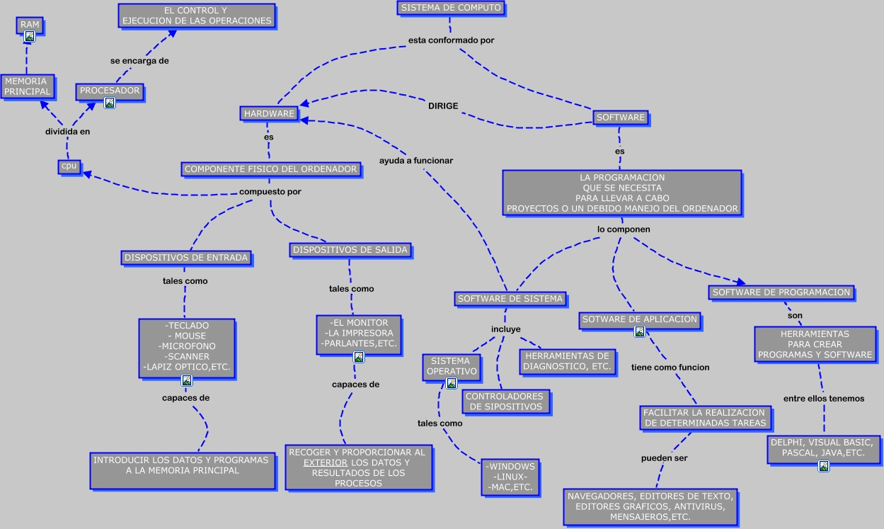 Este Cmap, tiene información relacionada con: SISTEMAS DE COMPUTO.cmap, SOFTWARE DIRIGE HARDWARE, MEMORIA PRINCIPAL ???? RAM, COMPONENTE FISICO DEL ORDENADOR compuesto por cpu, DISPOSITIVOS DE SALIDA tales como -EL MONITOR -LA IMPRESORA -PARLANTES,ETC., COMPONENTE FISICO DEL ORDENADOR compuesto por DISPOSITIVOS DE SALIDA, SOFTWARE DE SISTEMA incluye SISTEMA OPERATIVO, LA PROGRAMACION QUE SE NECESITA PARA LLEVAR A CABO PROYECTOS O UN DEBIDO MANEJO DEL ORDENADOR lo componen SOFTWARE DE SISTEMA, cpu dividida en MEMORIA PRINCIPAL, SISTEMA DE COMPUTO esta conformado por HARDWARE, SOFTWARE es LA PROGRAMACION QUE SE NECESITA PARA LLEVAR A CABO PROYECTOS O UN DEBIDO MANEJO DEL ORDENADOR, SISTEMA OPERATIVO tales como -WINDOWS -LINUX- -MAC,ETC., SOFTWARE DE SISTEMA incluye HERRAMIENTAS DE DIAGNOSTICO, ETC., DISPOSITIVOS DE ENTRADA tales como -TECLADO - MOUSE -MICROFONO -SCANNER -LAPIZ OPTICO,ETC., -TECLADO - MOUSE -MICROFONO -SCANNER -LAPIZ OPTICO,ETC. capaces de INTRODUCIR LOS DATOS Y PROGRAMAS A LA MEMORIA PRINCIPAL, SOFTWARE DE SISTEMA incluye CONTROLADORES DE SIPOSITIVOS, COMPONENTE FISICO DEL ORDENADOR compuesto por DISPOSITIVOS DE ENTRADA, SISTEMA DE COMPUTO esta conformado por SOFTWARE, SOFTWARE DE PROGRAMACION son HERRAMIENTAS PARA CREAR PROGRAMAS Y SOFTWARE, PROCESADOR se encarga de EL CONTROL Y EJECUCION DE LAS OPERACIONES, SOTWARE DE APLICACION tiene como funcion FACILITAR LA REALIZACION DE DETERMINADAS TAREAS