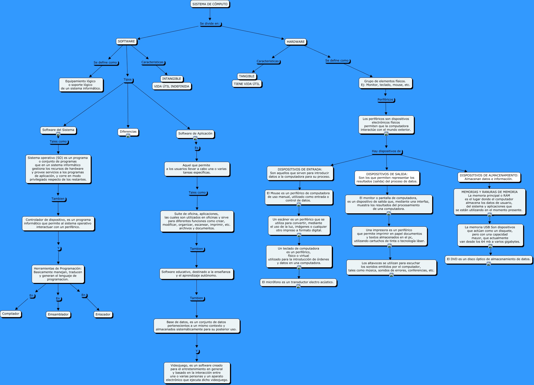 Este Cmap, tiene información relacionada con: SISTEMA DE COMPUTO, Grupo de elementos físicos. Ej: Monitor, teclado, mouse, etc. Periféricos Los periféricos son dispositivos electrónicos físicos permiten que la computadora interactúe con el mundo exterior., Un teclado de computadora es un periférico, físico o virtual utilizado para la introducción de órdenes y datos en una computadora. ???? El micrófono es un transductor electro acústico., Un escáner es un periférico que se utiliza para convertir, mediante el uso de la luz, imágenes o cualquier otro impreso a formato digital. ???? Un teclado de computadora es un periférico, físico o virtual utilizado para la introducción de órdenes y datos en una computadora., Herramientas de Programación: Basicamente manejan, traducen y generan el lenguaje de programacion. En Compilador, HARDWARE Se define como Grupo de elementos físicos. Ej: Monitor, teclado, mouse, etc., Aquel que permite a los usuarios llevar a cabo una o varias tareas específicas. Tales como Suite de oficina, aplicaciones, las cuales son utilizados en oficinas y sirve para diferentes funciones como crear, modificar, organizar, escanear, imprimir, etc. archivos y documentos., Los periféricos son dispositivos electrónicos físicos permiten que la computadora interactúe con el mundo exterior. Hay dispositivos de DISPOSITIVOS DE SALIDA: Son los que permiten representar los resultados (salida) del proceso de datos., MEMORIAS Y RANURAS DE MEMORIA La memoria principal o RAM es el lugar donde el computador almacena los datos de usuario, del sistema y aplicaciones que se están utilizando en el momento presente. ???? ????, DISPOSITIVOS DE ALMACENAMIENTO: Almacenan datos e información. ???? MEMORIAS Y RANURAS DE MEMORIA La memoria principal o RAM es el lugar donde el computador almacena los datos de usuario, del sistema y aplicaciones que se están utilizando en el momento presente., El Mouse es un periférico de computadora de uso manual, utilizado como entrada o control de datos. ???? Un escáner es un periférico que se utiliza para convertir, mediante el uso de la luz, imágenes o cualquier otro impreso a formato digital., Los periféricos son dispositivos electrónicos físicos permiten que la computadora interactúe con el mundo exterior. Hay dispositivos de DISPOSITIVOS DE ALMACENAMIENTO: Almacenan datos e información., El monitor o pantalla de computadora, es un dispositivo de salida que, mediante una interfaz, muestra los resultados del procesamiento de una computadora. ???? Una impresora es un periférico que permite imprimir en papel documentos y textos almacenados en el pc, utilizando cartuchos de tinta o tecnología láser., SISTEMA DE CÓMPUTO Se divide en: SOFTWARE, SISTEMA DE CÓMPUTO Se divide en: HARDWARE, DISPOSITIVOS DE SALIDA: Son los que permiten representar los resultados (salida) del proceso de datos. ???? El monitor o pantalla de computadora, es un dispositivo de salida que, mediante una interfaz, muestra los resultados del procesamiento de una computadora., Una impresora es un periférico que permite imprimir en papel documentos y textos almacenados en el pc, utilizando cartuchos de tinta o tecnología láser. ???? Los altavoces se utilizan para escuchar los sonidos emitidos por el computador, tales como música, sonidos de errores, conferencias, etc., HARDWARE Caracteristicas TANGIBLE, SOFTWARE Tipos Software del Sistema, Herramientas de Programación: Basicamente manejan, traducen y generan el lenguaje de programacion. En Enlazador, Herramientas de Programación: Basicamente manejan, traducen y generan el lenguaje de programacion. En Emsamblador