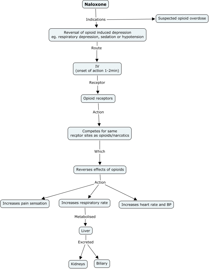 This Concept Map, created with IHMC CmapTools, has information related to: Naloxone, Reverses effects of opioids Action Increases pain sensation, Naloxone Indications Suspected opioid overdose, Reversal of opioid induced depression eg. respiratory depression, sedation or hypotension Route IV (onset of action 1-2min), Opioid receptors Action Competes for same recptor sites as opioids/narcotics, Increases respiratory rate Metabolised Liver, IV (onset of action 1-2min) Receptor Opioid receptors, Naloxone Indications Reversal of opioid induced depression eg. respiratory depression, sedation or hypotension, Liver Excreted Kidneys, Competes for same recptor sites as opioids/narcotics Which Reverses effects of opioids, Liver Excreted Biliary, Reverses effects of opioids Action Increases respiratory rate, Reverses effects of opioids Action Increases heart rate and BP