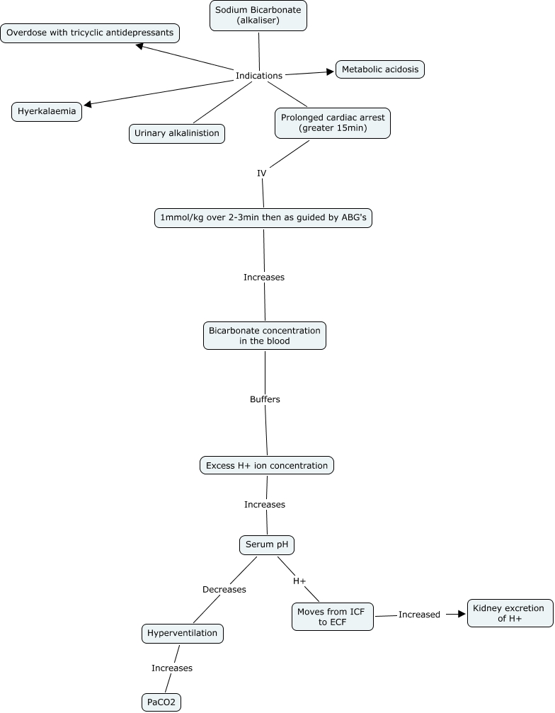 This Concept Map, created with IHMC CmapTools, has information related to: Sodium Bicarbonate, Sodium Bicarbonate (alkaliser) Indications Metabolic acidosis, Sodium Bicarbonate (alkaliser) Indications Urinary alkalinistion, Sodium Bicarbonate (alkaliser) Indications Hyerkalaemia, Sodium Bicarbonate (alkaliser) Indications Overdose with tricyclic antidepressants, Sodium Bicarbonate (alkaliser) Indications Prolonged cardiac arrest (greater 15min), Serum pH Decreases Hyperventilation, Bicarbonate concentration in the blood Buffers Excess H+ ion concentration, Prolonged cardiac arrest (greater 15min) IV 1mmol/kg over 2-3min then as guided by ABG's, Hyperventilation Increases PaCO2, Serum pH H+ Moves from ICF to ECF, Moves from ICF to ECF Increased Kidney excretion of H+, 1mmol/kg over 2-3min then as guided by ABG's Increases Bicarbonate concentration in the blood, Excess H+ ion concentration Increases Serum pH