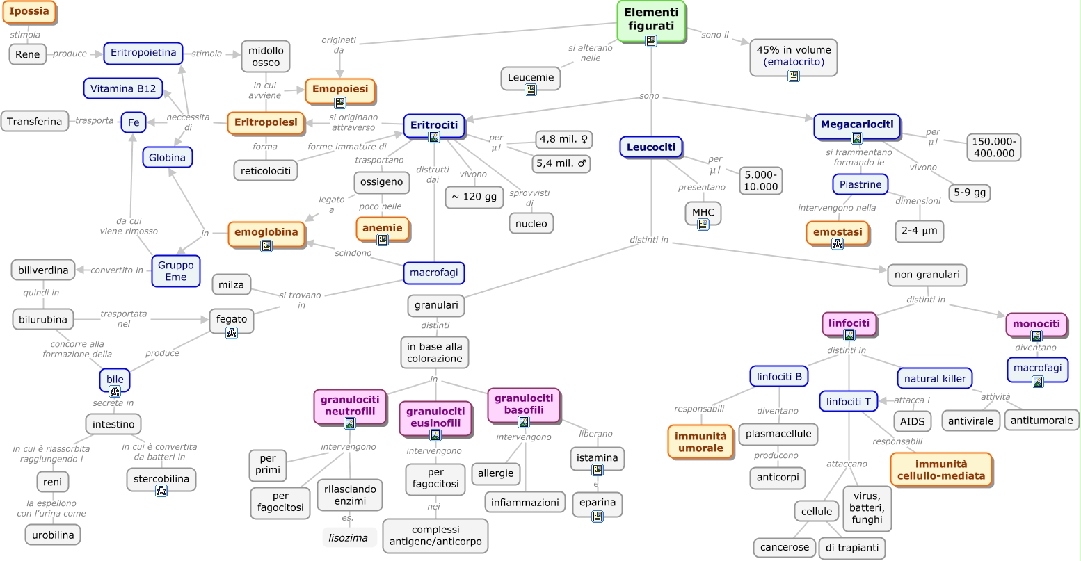 Questa Cmap, creata con IHMC CmapTools, contiene informazioni relative a: Elementi figurati, granulociti eusinofili intervengono per fagocitosi, Eritropoiesi neccessita di Fe, intestino in cui è convertita da batteri in stercobilina, macrofagi si trovano in fegato, Eritrociti vivono ~ 120 gg, Eritropoiesi neccessita di Eritropoietina, istamina e eparina, Rene produce Eritropoietina, non granulari distinti in monociti, ossigeno legato a emoglobina, bilurubina trasportata nel fegato, biliverdina quindi in bilurubina, Leucociti presentano MHC, Piastrine dimensioni 2-4 μm, Eritrociti distrutti dai macrofagi, plasmacellule producono anticorpi, midollo osseo in cui avviene Emopoiesi, macrofagi scindono emoglobina, Ipossia stimola Rene, linfociti T attaccano cellule