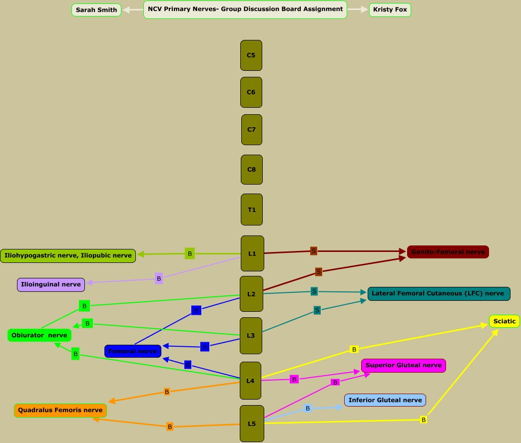 This Concept Map, created with IHMC CmapTools, has information related to: NDSS AHSC 430 Smith Fox Week 7 NCV, L4 B Superior Gluteal nerve, L1 B Iliohypogastric nerve, Iliopubic nerve, L4 B Quadralus Femoris nerve, L1 B Ilioinguinal nerve, L2 S Lateral Femoral Cutaneous (LFC) nerve, L5 B Superior Gluteal nerve, L3 B Obiurator nerve, L2 B Femoral nerve, L4 B Femoral nerve, L2 B Obiurator nerve, L5 B Inferior Gluteal nerve, L3 S Lateral Femoral Cutaneous (LFC) nerve, L4 B Obiurator nerve, L4 B Sciatic, L1 S Genito-Femoral nerve, L5 B Sciatic, NCV Primary Nerves- Group Discussion Board Assignment ???? Kristy Fox, NCV Primary Nerves- Group Discussion Board Assignment ???? Sarah Smith, L2 S Genito-Femoral nerve, L5 B Quadralus Femoris nerve
