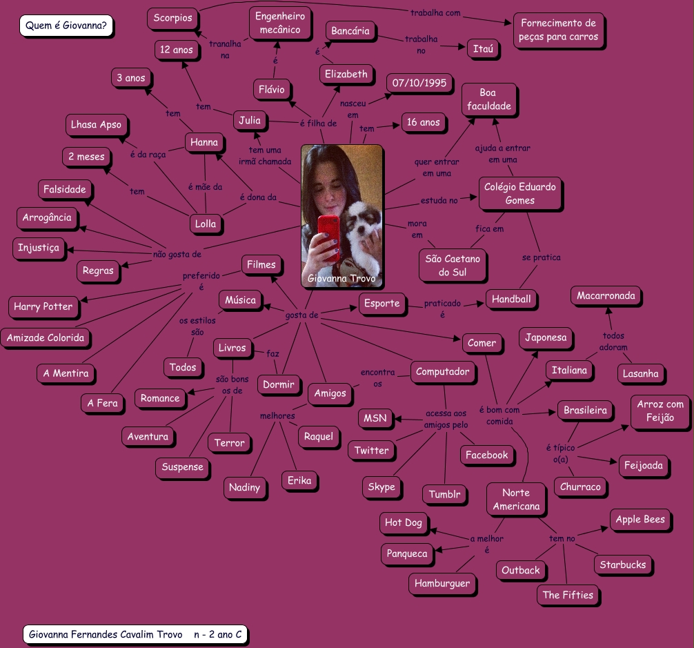 Esse mapa conceitual, produzido no IHMC CmapTools, tem a informação relacionada a: Quem é Giovanna, Amigos melhores Nadiny, Livros são bons os de Romance, Giovanna Trovo estuda no Colégio Eduardo Gomes, Giovanna Trovo quer entrar em uma Boa faculdade, Giovanna Trovo gosta de Esporte, Giovanna Trovo nasceu em 07/10/1995, Computador acessa aos amigos pelo Tumblr, Filmes preferido é A Mentira, Colégio Eduardo Gomes se pratica Handball, Giovanna Trovo não gosta de Regras, Giovanna Trovo gosta de Computador, Giovanna Trovo gosta de Filmes, Giovanna Trovo é filha de Flávio, Brasileira é típico o(a) Churraco, Giovanna Trovo não gosta de Injustiça, Comer é bom com comida Brasileira, Hanna é mãe da Lolla, Norte Americana tem no Starbucks, Flávio é Engenheiro mecânico, Computador encontra os Amigos