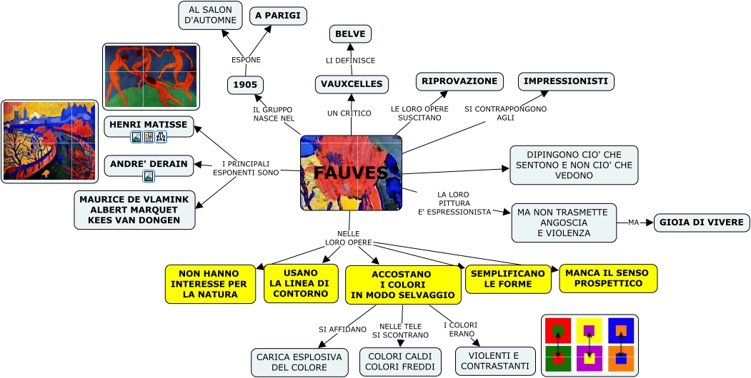 Questa Cmap, creata con IHMC CmapTools, contiene informazioni relative a: FAUVES, 1905 ESPONE AL SALON D'AUTOMNE, FAUVES NELLE LORO OPERE USANO LA LINEA DI CONTORNO, 1905 ESPONE A PARIGI, FAUVES NELLE LORO OPERE ACCOSTANO I COLORI IN MODO SELVAGGIO, FAUVES NELLE LORO OPERE MANCA IL SENSO PROSPETTICO, FAUVES NELLE LORO OPERE SEMPLIFICANO LE FORME, FAUVES I PRINCIPALI ESPONENTI SONO MAURICE DE VLAMINK ALBERT MARQUET KEES VAN DONGEN, FAUVES I PRINCIPALI ESPONENTI SONO ANDRE' DERAIN, FAUVES LE LORO OPERE SUSCITANO RIPROVAZIONE, FAUVES PERCHE' DIPINGONO CIO' CHE SENTONO E NON CIO' CHE VEDONO, ACCOSTANO I COLORI IN MODO SELVAGGIO I COLORI ERANO VIOLENTI E CONTRASTANTI, ACCOSTANO I COLORI IN MODO SELVAGGIO NELLE TELE SI SCONTRANO COLORI CALDI COLORI FREDDI, VAUXCELLES LI DEFINISCE BELVE, FAUVES SI CONTRAPPONGONO AGLI IMPRESSIONISTI, FAUVES UN CRITICO VAUXCELLES, FAUVES I PRINCIPALI ESPONENTI SONO HENRI MATISSE, FAUVES NELLE LORO OPERE NON HANNO INTERESSE PER LA NATURA, MA NON TRASMETTE ANGOSCIA E VIOLENZA MA GIOIA DI VIVERE, FAUVES LA LORO PITTURA E' ESPRESSIONISTA MA NON TRASMETTE ANGOSCIA E VIOLENZA, ACCOSTANO I COLORI IN MODO SELVAGGIO SI AFFIDANO CARICA ESPLOSIVA DEL COLORE