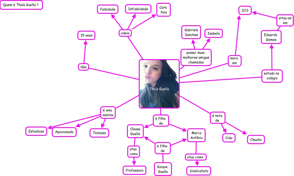 Esse mapa conceitual, produzido no IHMC CmapTools, tem a informação relacionada a: Thaís Guella 2c, Thaís Guella possui duas melhores amigas chamadas Gabriela Sanches, Thaís Guella é neta de Claudio, Cleusa Guella atua como Professora, Thaís Guella odeia Cara feia, Kaique Guella é filho de Cleusa Guella, Thaís Guella é uma menina Apaixonada, Thaís Guella é uma menina Teimosa, Marco Antônio atua como Sindicalista, Thaís Guella é neta de Cida, Eduardo Gomes situa-se em SCS, Kaique Guella é filho de Marco Antônio, Thaís Guella mora em SCS, Thaís Guella é filha de Marco Antônio, Thaís Guella possui duas melhores amigas chamadas Isabela, Thaís Guella odeia Infidelidade, Thaís Guella é uma menina Estudiosa, Thaís Guella é filha de Cleusa Guella, Thaís Guella têm 15 anos, Thaís Guella odeia Falsidade, Thaís Guella estuda no colégio Eduardo Gomes