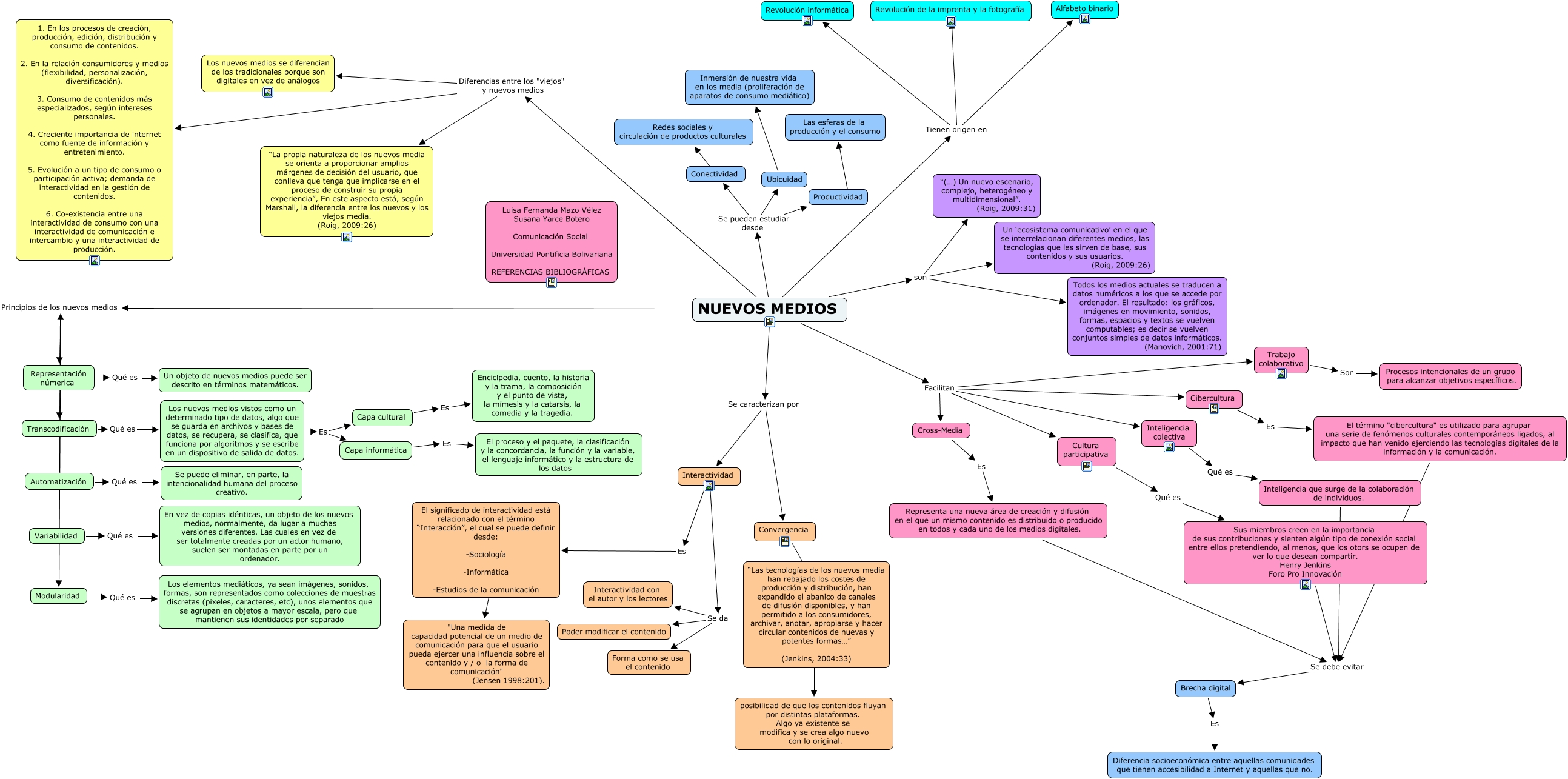 Este Cmap, tiene información relacionada con: Medios interactivos, NUEVOS MEDIOS Principios de los nuevos medios Representación númerica, NUEVOS MEDIOS Se caracterizan por Convergencia, Cross-Media Es Representa una nueva área de creación y difusión en el que un mismo contenido es distribuido o producido en todos y cada uno de los medios digitales., Cultura participativa Qué es Sus miembros creen en la importancia de sus contribuciones y sienten algún tipo de conexión social entre ellos pretendiendo, al menos, que los otors se ocupen de ver lo que desean compartir. Henry Jenkins Foro Pro Innovación, Convergencia ???? “Las tecnologías de los nuevos media han rebajado los costes de producción y distribución, han expandido el abanico de canales de difusión disponibles, y han permitido a los consumidores, archivar, anotar, apropiarse y hacer circular contenidos de nuevas y potentes formas…” (Jenkins, 2004:33), Automatización Principios de los nuevos medios Modularidad, NUEVOS MEDIOS Se pueden estudiar desde Ubicuidad, Representación númerica Qué es Un objeto de nuevos medios puede ser descrito en términos matemáticos., NUEVOS MEDIOS Diferencias entre los "viejos" y nuevos medios Los nuevos medios se diferencian de los tradicionales porque son digitales en vez de análogos, NUEVOS MEDIOS Tienen origen en Alfabeto binario, Sus miembros creen en la importancia de sus contribuciones y sienten algún tipo de conexión social entre ellos pretendiendo, al menos, que los otors se ocupen de ver lo que desean compartir. Henry Jenkins Foro Pro Innovación Se debe evitar Brecha digital, Trabajo colaborativo Son Procesos intencionales de un grupo para alcanzar objetivos específicos., Cibercultura Es El término "cibercultura" es utilizado para agrupar una serie de fenómenos culturales contemporáneos ligados, al impacto que han venido ejerciendo las tecnologías digitales de la información y la comunicación., NUEVOS MEDIOS Facilitan Cibercultura, Inteligencia que surge de la colaboración de individuos. Se debe evitar Brecha digital, Modularidad Qué es Los elementos mediáticos, ya sean imágenes, sonidos, formas, son representados como colecciones de muestras discretas (pixeles, caracteres, etc), unos elementos que se agrupan en objetos a mayor escala, pero que mantienen sus identidades por separado, NUEVOS MEDIOS son “(…) Un nuevo escenario, complejo, heterogéneo y multidimensional”. (Roig, 2009:31), Interactividad Es El significado de interactividad está relacionado con el término “Interacción”, el cual se puede definir desde: -Sociología -Informática -Estudios de la comunicación, Interactividad Se da Forma como se usa el contenido, NUEVOS MEDIOS Se pueden estudiar desde Conectividad
