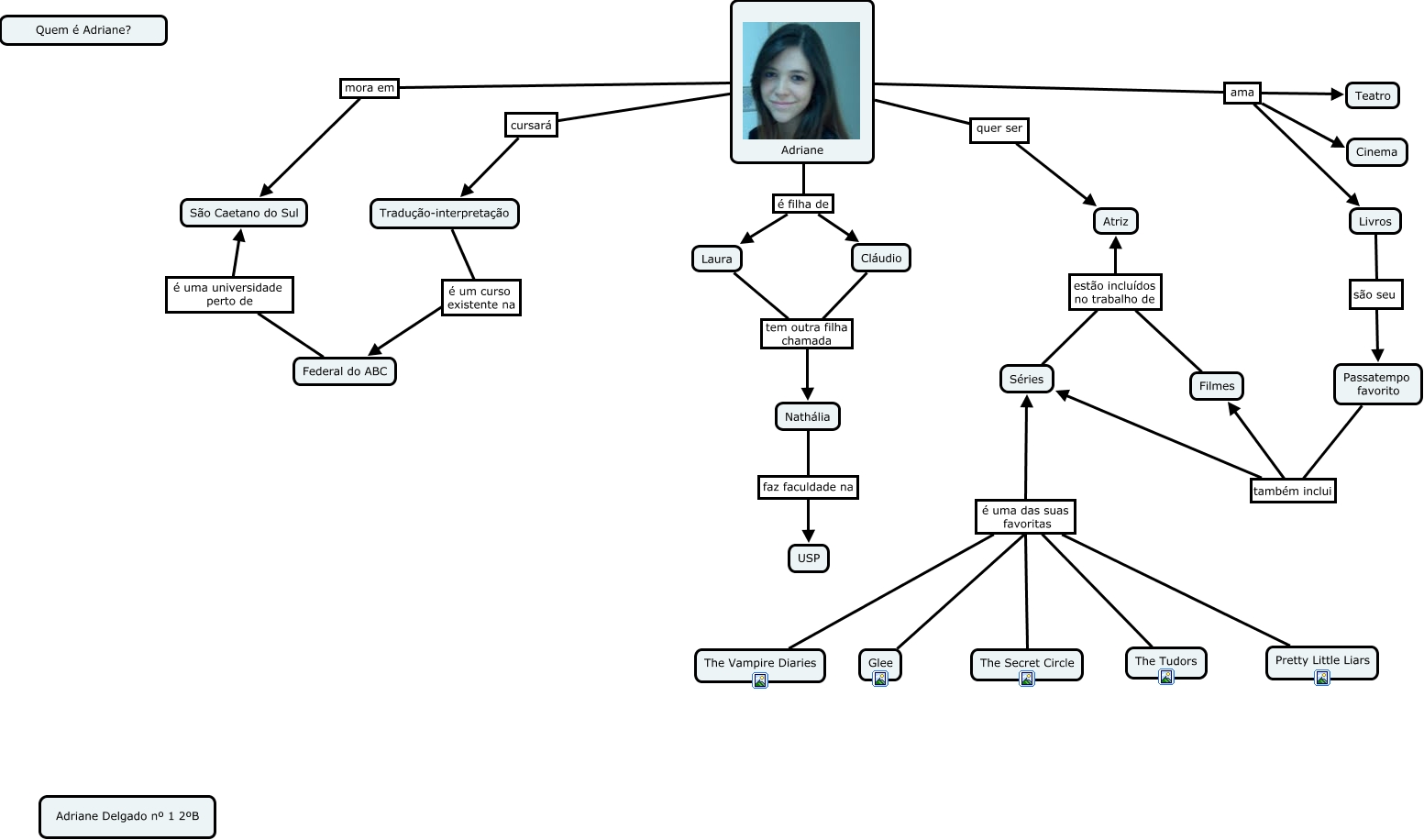 Esse mapa conceitual, produzido no IHMC CmapTools, tem a informação relacionada a: Quem sou eu, Adriane cursará Tradução-interpretação, Adriane ama Teatro, Passatempo favorito também inclui Filmes, Pretty Little Liars é uma das suas favoritas Séries, Adriane ama Cinema, Adriane é filha de Cláudio, Tradução-interpretação é um curso existente na Federal do ABC, Federal do ABC é uma universidade perto de São Caetano do Sul, Nathália faz faculdade na USP, Adriane ama Livros, Adriane é filha de Laura, Filmes estão incluídos no trabalho de Atriz, Adriane mora em São Caetano do Sul, Passatempo favorito também inclui Séries, The Secret Circle é uma das suas favoritas Séries, The Tudors é uma das suas favoritas Séries, Livros são seu Passatempo favorito, The Vampire Diaries é uma das suas favoritas Séries, Adriane quer ser Atriz, Laura tem outra filha chamada Nathália