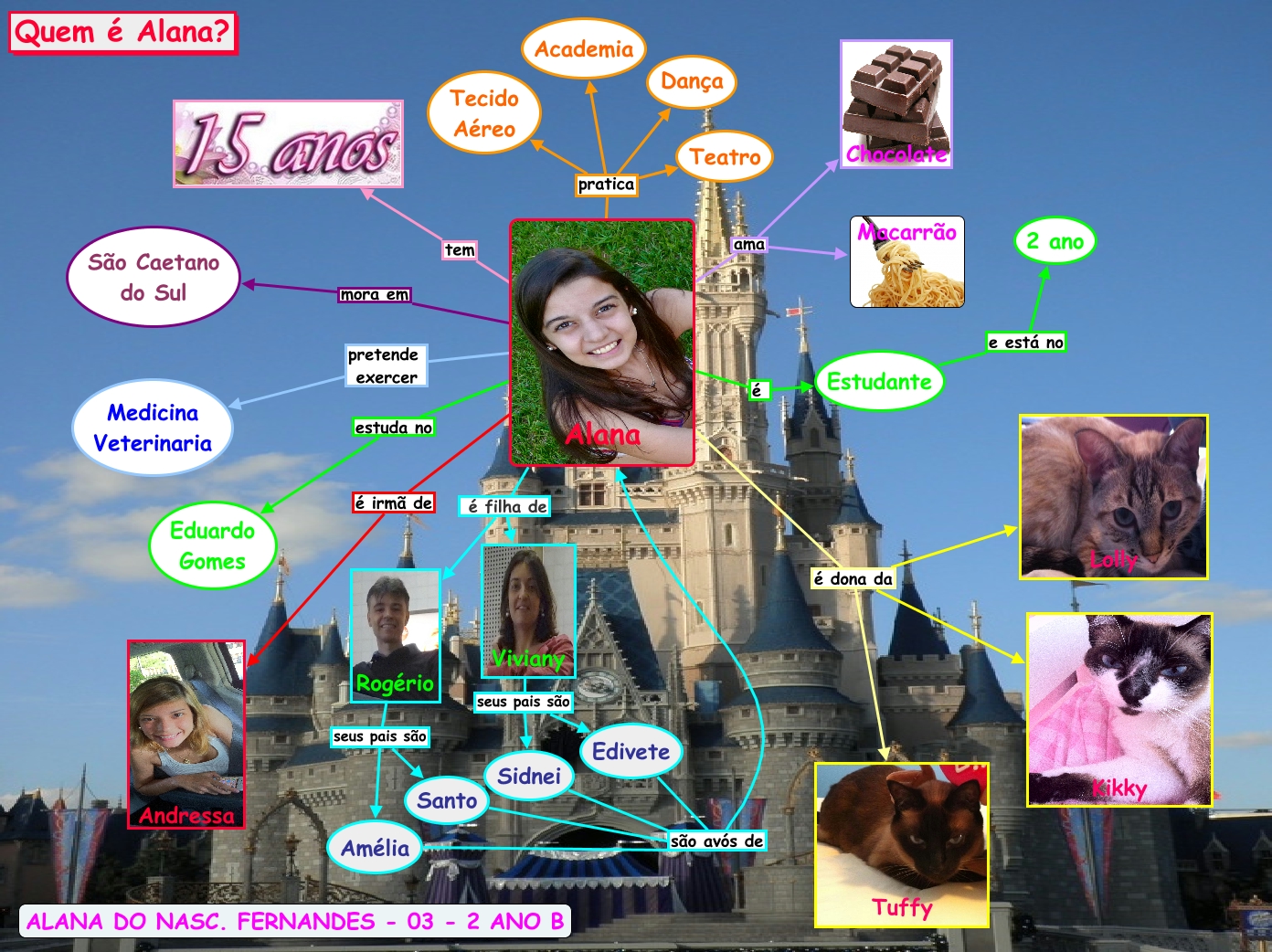 Esse mapa conceitual, produzido no IHMC CmapTools, tem a informação relacionada a: Alana Fernandes N°03, Estudante e está no 2 ano, Alana é dona da Kikky, Alana pratica Teatro, Viviany seus pais são Sidnei, Alana é Estudante, Rogério seus pais são Santo, Alana pratica Academia, Alana pratica Dança, Alana é filha de Viviany, Alana é dona da Lolly, Amélia são avós de Alana, Rogério seus pais são Amélia, Alana é filha de Rogério, Alana tem, Alana estuda no Eduardo Gomes, Alana ama Macarrão, Alana pratica Tecido Aéreo, Alana é dona da Tuffy, Santo são avós de Alana, Sidnei são avós de Alana
