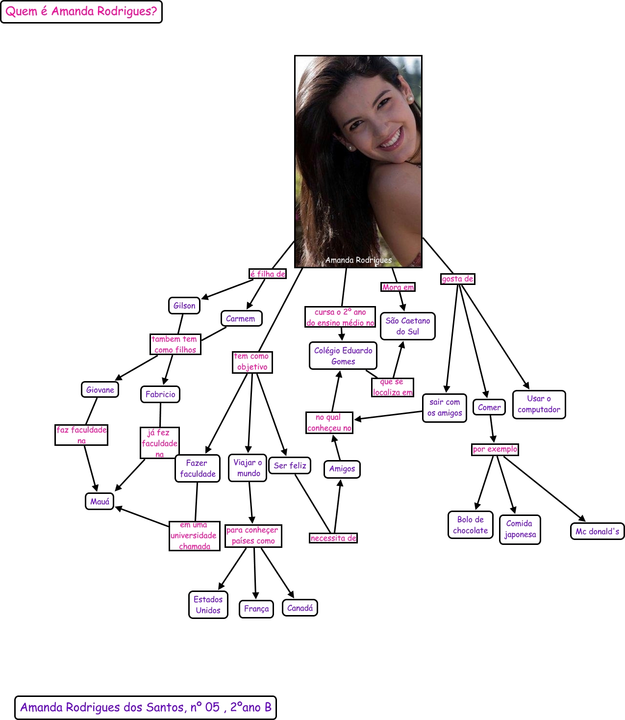 This Concept Map, created with IHMC CmapTools, has information related to: Amanda Rodrigues, nº 05, Amanda Rodrigues é filha de Carmem, Amigos no qual conheçeu no Colégio Eduardo Gomes, Viajar o mundo para conheçer países como Estados Unidos, Colégio Eduardo Gomes que se localiza em São Caetano do Sul, Comer por exemplo Mc donald's, Giovane faz faculdade na Mauá, Carmem tambem tem como filhos Giovane, Amanda Rodrigues gosta de sair com os amigos, Viajar o mundo para conheçer países como Canadá, Fazer faculdade em uma universidade chamada Mauá, Carmem tambem tem como filhos Fabricio, Amanda Rodrigues Mora em São Caetano do Sul, Fabricio já fez faculdade na Mauá, Amanda Rodrigues tem como objetivo Viajar o mundo, sair com os amigos no qual conheçeu no Colégio Eduardo Gomes, Amanda Rodrigues é filha de Gilson, Amanda Rodrigues gosta de Usar o computador, Viajar o mundo para conheçer países como França, Ser feliz necessita de Amigos, Comer por exemplo Bolo de chocolate
