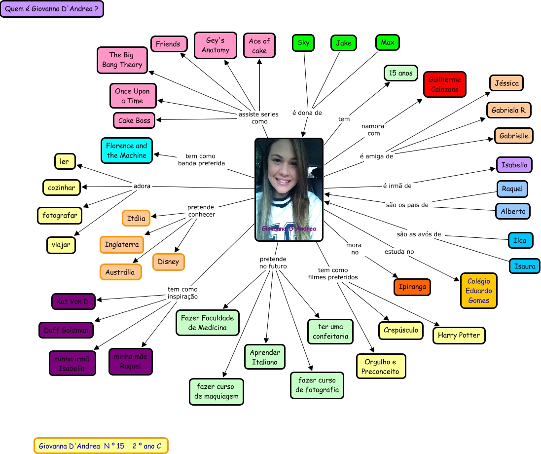 Esse mapa conceitual, produzido no IHMC CmapTools, tem a informação relacionada a: Giovanna D'Andrea, n15, Giovanna D'Andrea tem como inspiração Duff Goldman, Giovanna D'Andrea é irmã de Isabella, Alberto são os pais de Giovanna D'Andrea, Giovanna D'Andrea tem como inspiração minha mãe Raquel, Giovanna D'Andrea pretende no futuro fazer curso de fotografia, Raquel são os pais de Giovanna D'Andrea, Isaura são as avós de Giovanna D'Andrea, Giovanna D'Andrea assiste series como Cake Boss, Giovanna D'Andrea tem como banda preferida Florence and the Machine, Giovanna D'Andrea assiste series como The Big Bang Theory, Giovanna D'Andrea namora com Guilherme Calazans, Jake é dona de Giovanna D'Andrea, Giovanna D'Andrea pretende conhecer Itália, Giovanna D'Andrea tem como inspiração minha irmã Isabella, Giovanna D'Andrea tem como inspiração Kat Von D, Giovanna D'Andrea tem como filmes preferidos Orgulho e Preconceito, Max é dona de Giovanna D'Andrea, Giovanna D'Andrea é amiga de Gabriela R., Giovanna D'Andrea adora cozinhar, Giovanna D'Andrea assiste series como Gey's Anatomy