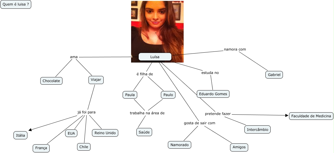 Esse mapa conceitual, produzido no IHMC CmapTools, tem a informação relacionada a: Luisa Reginato Nº24.cmap, Luísa ama Chocolate, Luísa ama Viajar, Viajar já foi para Reino Unido, Luísa namora com Gabriel, Viajar já foi para Itália, Viajar já foi para Chile, Luísa estuda no Eduardo Gomes, Viajar já foi para EUA, Viajar já foi para França, Luísa pretende fazer Faculdade de Medicina, Luísa é filha de Paula, Luísa é filha de Paulo, Paula trabalha na área de Saúde, Paulo trabalha na área de Saúde, Luísa gosta de sair com Namorado, Luísa pretende fazer Intercâmbio, Luísa gosta de sair com Amigos