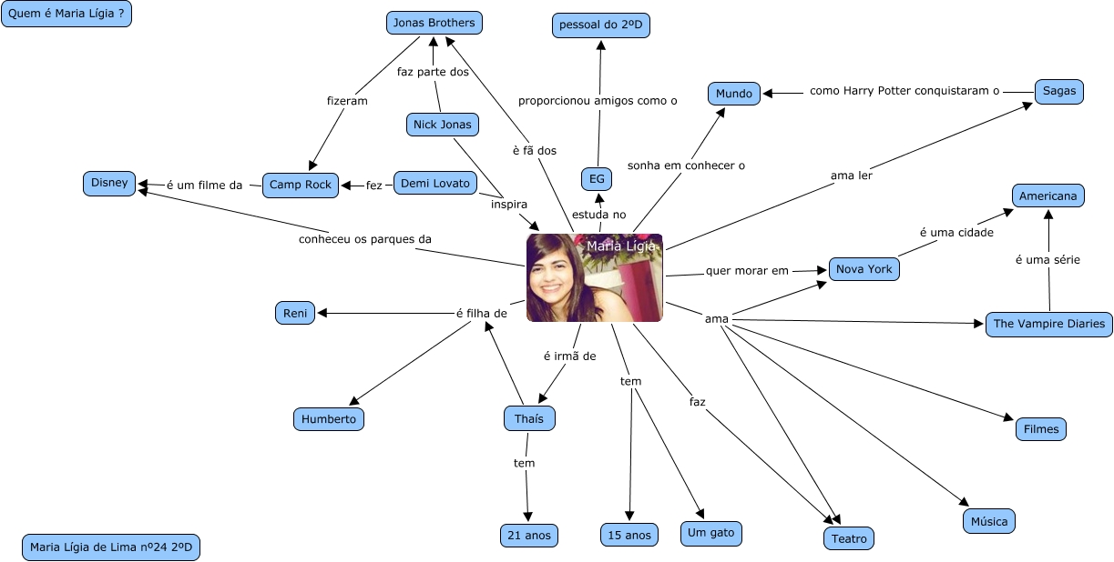 Esse mapa conceitual, produzido no IHMC CmapTools, tem a informação relacionada a: Quem é Maria Lígia, Maria Lígia estuda no EG, Maria Lígia è fã dos Jonas Brothers, Maria Lígia quer morar em Nova York, Maria Lígia ama Música, Nick Jonas faz parte dos Jonas Brothers, Maria Lígia ama Filmes, Maria Lígia sonha em conhecer o Mundo, Sagas como Harry Potter conquistaram o Mundo, Maria Lígia tem 15 anos, Maria Lígia é irmã de Thaís, Maria Lígia ama The Vampire Diaries, Thaís tem 21 anos, Maria Lígia ama Teatro, The Vampire Diaries é uma série Americana, Camp Rock é um filme da Disney, Jonas Brothers fizeram Camp Rock, Demi Lovato fez Camp Rock, Thaís é filha de Reni, Maria Lígia é filha de Humberto, Thaís é filha de Humberto