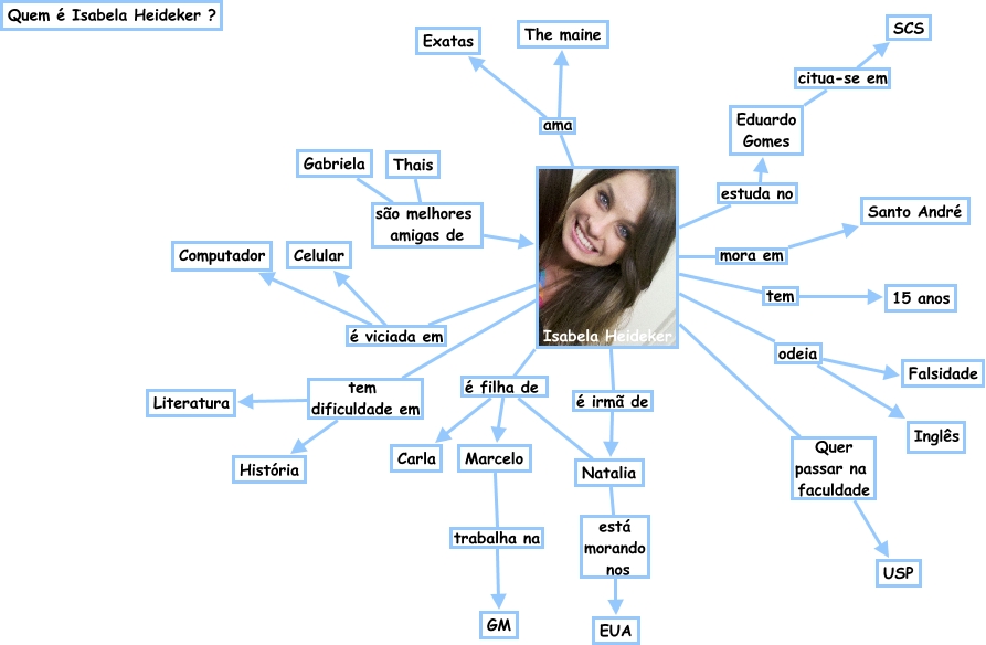 Esse mapa conceitual, produzido no IHMC CmapTools, tem a informação relacionada a: Isabela Heideker nº19, Isabela Heideker é irmã de Natalia, Isabela Heideker é filha de Carla, Isabela Heideker é viciada em Celular, Thais são melhores amigas de Isabela Heideker, Natalia é filha de Marcelo, Isabela Heideker é filha de Marcelo, Eduardo Gomes citua-se em SCS, Isabela Heideker ama The maine, Marcelo trabalha na GM, Isabela Heideker ama Exatas, Isabela Heideker odeia Inglês, Natalia é filha de Carla, Isabela Heideker estuda no Eduardo Gomes, Isabela Heideker mora em Santo André, Isabela Heideker tem 15 anos, Isabela Heideker odeia Falsidade, Isabela Heideker Quer passar na faculdade USP, Isabela Heideker tem dificuldade em História, Natalia está morando nos EUA, Gabriela são melhores amigas de Isabela Heideker