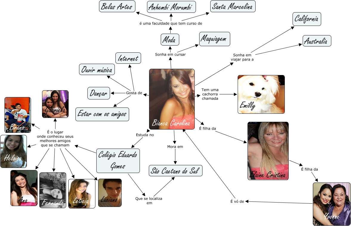 Esse mapa conceitual, produzido no IHMC CmapTools, tem a informação relacionada a: Bianca Carolina N 04 2C, Bianca Carolina É filha da Elaine Cristina, Bianca Carolina Sonha em cursar Moda, Colégio Eduardo Gomes É o lugar onde conheceu seus melhores amigos que se chamam Bruno, Bianca Carolina Tem uma cachorra chamada Emilly, Colégio Eduardo Gomes É o lugar onde conheceu seus melhores amigos que se chamam Fernanda, Bianca Carolina Mora em São Caetano do Sul, Moda é uma faculdade que tem curso de Anhembi Morumbi, Bianca Carolina Gosta de Estar com os amigos, Elaine Cristina É filha da Yvonne, Bianca Carolina Estuda no Colégio Eduardo Gomes, Bianca Carolina Sonha em cursar Maquiagem, Colégio Eduardo Gomes É o lugar onde conheceu seus melhores amigos que se chamam Heloisa, Bianca Carolina Gosta de Dançar, Moda é uma faculdade que tem curso de Santa Marcelina, Colégio Eduardo Gomes Que se localiza em São Caetano do Sul, Colégio Eduardo Gomes É o lugar onde conheceu seus melhores amigos que se chamam Leticia, Bianca Carolina Sonha em viajar para a California, Yvonne É vó de ????, Bianca Carolina Gosta de Internet, Colégio Eduardo Gomes É o lugar onde conheceu seus melhores amigos que se chamam Luciano
