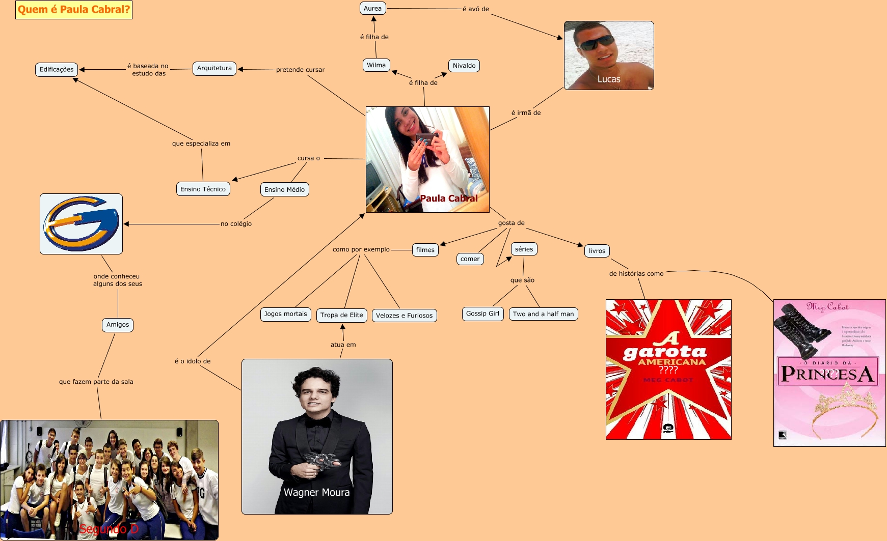 Esse mapa conceitual, produzido no IHMC CmapTools, tem a informação relacionada a: Quem sou eu Paula, filmes como por exemplo Jogos mortais, filmes como por exemplo Velozes e Furiosos, livros de histórias como ????, Paula Cabral pretende cursar Arquitetura, livros de histórias como ????, Paula Cabral é filha de Wilma, Wagner Moura é o idolo de Paula Cabral, Paula Cabral gosta de comer, Paula Cabral é filha de Nivaldo, Lucas é irmã de Paula Cabral, Aurea é avó de Lucas, Wilma é filha de Aurea, Paula Cabral gosta de séries, Ensino Médio no colégio, Paula Cabral gosta de livros, Amigos que fazem parte da sala Segundo D, Wagner Moura atua em Tropa de Elite, Ensino Técnico que especializa em Edificações, Paula Cabral cursa o Ensino Técnico, Paula Cabral gosta de filmes