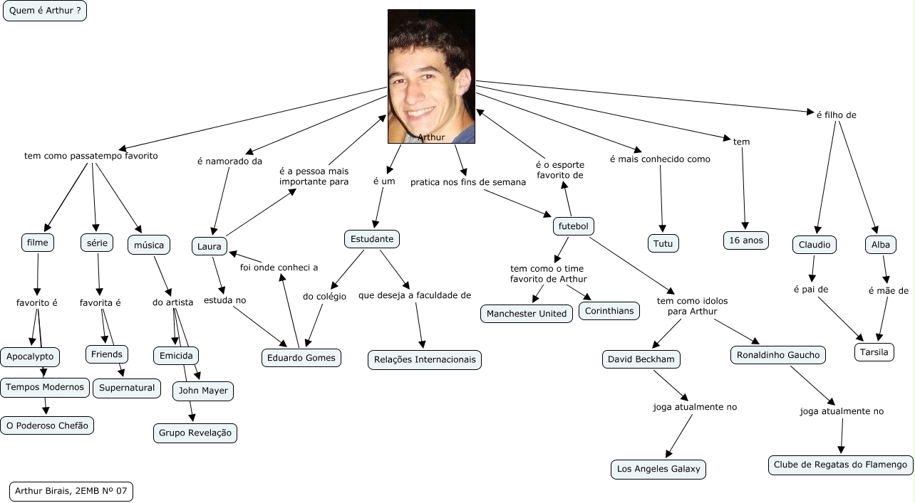 Esse mapa conceitual, produzido no IHMC CmapTools, tem a informação relacionada a: Arthur Birais 2°B numero 07, Ronaldinho Gaucho joga atualmente no Clube de Regatas do Flamengo, filme favorito é Apocalypto, filme favorito é O Poderoso Chefão, Arthur pratica nos fins de semana futebol, Alba é mãe de Tarsila, Arthur é filho de Alba, futebol tem como idolos para Arthur Ronaldinho Gaucho, série favorita é Friends, Arthur é mais conhecido como Tutu, Laura é a pessoa mais importante para Arthur, Arthur é filho de Claudio, Arthur tem como passatempo favorito filme, filme favorito é Tempos Modernos, Estudante do colégio Eduardo Gomes, Arthur tem como passatempo favorito série, futebol tem como idolos para Arthur David Beckham, futebol tem como o time favorito de Arthur Manchester United, Estudante que deseja a faculdade de Relações Internacionais, David Beckham joga atualmente no Los Angeles Galaxy, Arthur é um Estudante