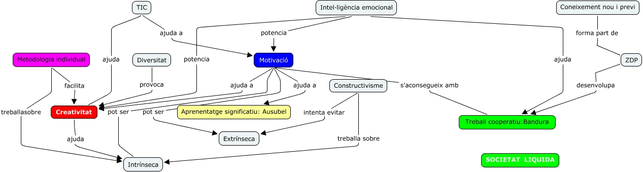 Este Cmap, tiene información relacionada con: Mapa general, Metodologia individual treballasobre Intrínseca, Intel·ligència emocional ajuda Treball cooperatiu:Bandura, ZDP desenvolupa Treball cooperatiu:Bandura, Motivació ajuda a Aprenentatge significatiu: Ausubel, Creativitat ajuda Intrínseca, TIC ajuda a Motivació, Motivació ajuda a Creativitat, TIC ajuda Creativitat, Motivació pot ser Extrínseca, Metodologia individual facilita Creativitat, Intel·ligència emocional potencia Motivació, Motivació s'aconsegueix amb Treball cooperatiu:Bandura, Diversitat provoca Creativitat, Coneixement nou i previ forma part de ZDP, Motivació pot ser Intrínseca, Intel·ligència emocional potencia Creativitat, Constructivisme intenta evitar Extrínseca, Constructivisme treballa sobre Intrínseca