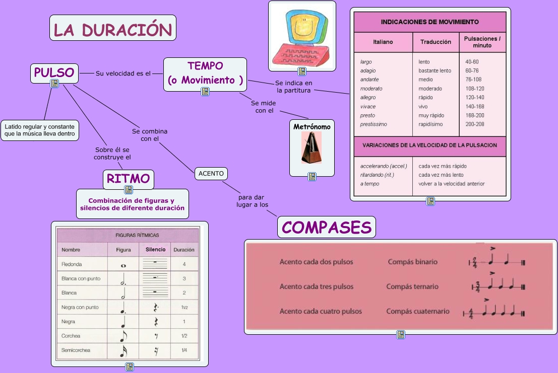 Este Cmap, tiene información relacionada con: Duración1, PULSO ¿Qué es? Latido regular y constante que la música lleva dentro, ACENTO para dar lugar a los COMPASES, PULSO Sobre él se construye el RITMO, PULSO Su velocidad es el TEMPO (o Movimiento ), RITMO ¿Qué es? Combinación de figuras y silencios de diferente duración, TEMPO (o Movimiento ) Se mide con el Metrónomo, PULSO Se combina con el ACENTO, TEMPO (o Movimiento ) Se indica en la partitura
