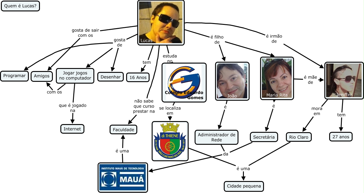 Esse mapa conceitual, produzido no IHMC CmapTools, tem a informação relacionada a: Lucas Corrêa Nº 22, Lucas gosta de sair com os Amigos, Lucas gosta de Jogar jogos no computador, Lucas não sabe que curso prestar na Faculdade, Rio Claro é uma Cidade pequena, Adiministrador de Rede da, Jeniffer mora em Rio Claro, Jeniffer tem 27 anos, Secretária da, Jogar jogos no computador com os Amigos, Lucas gosta de Programar, Lucas tem 16 Anos, é uma Faculdade, João é Adiministrador de Rede, Lucas é irmão de Jeniffer, é uma Cidade pequena, Lucas é filho de João, Lucas estuda no Colegio Eduardo Gomes, Lucas gosta de Desenhar, Colegio Eduardo Gomes se localiza em, Maria Rita é Secretária