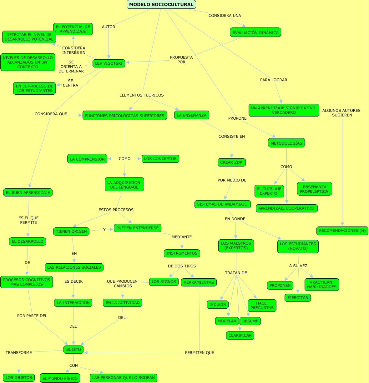 Este Cmap, tiene información relacionada con: PARADIGMA SOCIOCULTURAL, FUNCIONES PSICOLÓGICAS SUPERIORES COMO LOS CONCEPTOS, SISTEMAS DE ANDAMIAJE EN DONDE LOS ESTUDIANTES (NOVATO), MODELO SOCIOCULTURAL PROPONE METODOLOGÍAS, LEV VIGOTSKI CONSIDERA INTERÉS EN EL POTENCIAL DE APRENDIZAJE, LEV VIGOTSKI SE ORIENTA A DETERMINAR NIVELES DE DESARROLLO ALCANZADOS EN UN CONTEXTO, LA INTERACCION DEL SUJETO, LOS ESTUDIANTES (NOVATO) A SU VEZ PROPONEN, METODOLOGÍAS COMO APRENDIZAJE COOPERATIVO, SUJETO TRANSFORME LOS OBJETOS, LEV VIGOTSKI CONSIDERA QUE EL BUEN APRENDIZAJE, FUNCIONES PSICOLÓGICAS SUPERIORES COMO LA ADQUISICIÓN DEL LENGUAJE, MODELO SOCIOCULTURAL CONSIDERA UNA EVALUACIÓN DINÁMICA, LA ADQUISICIÓN DEL LENGUAJE ESTOS PROCESOS PUEDEN ENTENDERSE, LOS MAESTROS (EXPERTOS) TRATAN DE INDUCIR, LEV VIGOTSKI SE CENTRA EN EL PROCESO DE LOS ESTUDIANTES, PROCESOS COGNITIVOS MAS COMPLEJOS POR PARTE DEL SUJETO, HERRAMIENTAS PERMITEN QUE SUJETO, MODELO SOCIOCULTURAL PARA LOGRAR UN APRENDIZAJE SIGNIFICATIVO VERDADERO, LOS MAESTROS (EXPERTOS) TRATAN DE RESUME, TIENEN ORIGEN Y PUEDEN ENTENDERSE