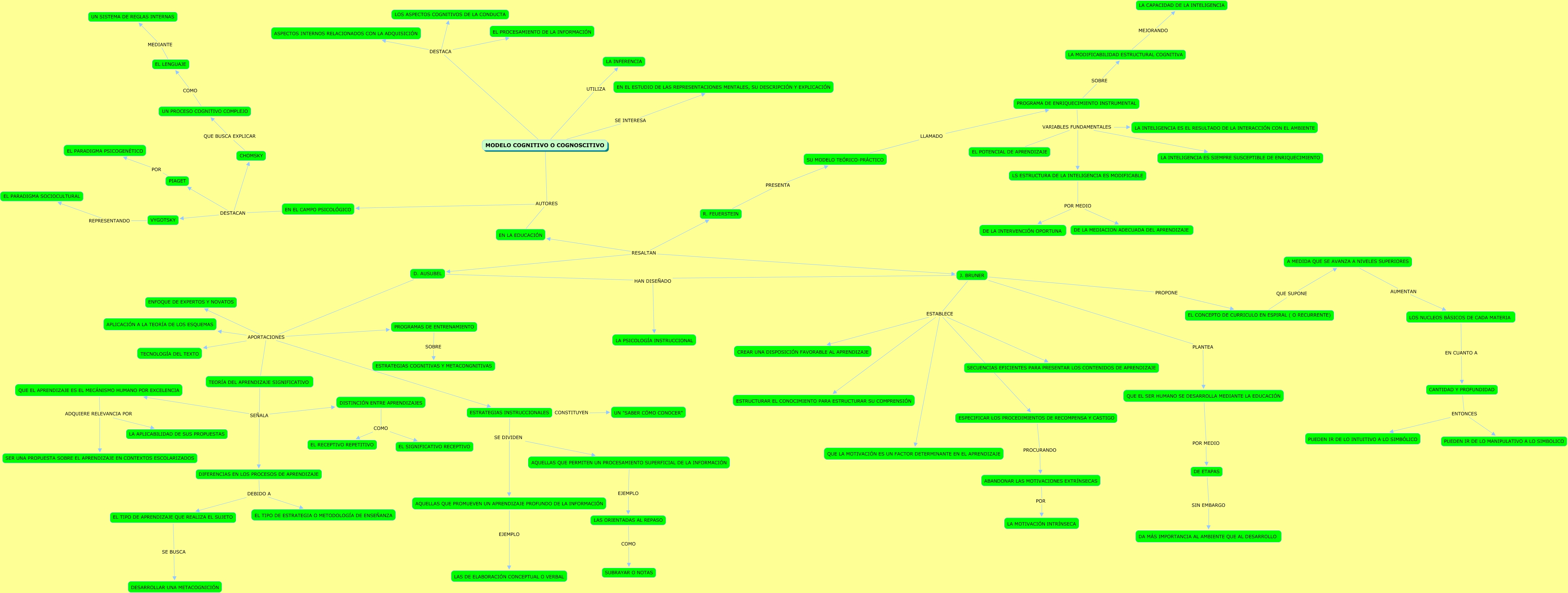 Este Cmap, tiene información relacionada con: PARADIGMA COGNOSCITIVISTA, DE ETAPAS SIN EMBARGO DA MÁS IMPORTANCIA AL AMBIENTE QUE AL DESARROLLO, QUE EL APRENDIZAJE ES EL MECÁNISMO HUMANO POR EXCELENCIA ADQUIERE RELEVANCIA POR SER UNA PROPUESTA SOBRE EL APRENDIZAJE EN CONTEXTOS ESCOLARIZADOS, A MEDIDA QUE SE AVANZA A NIVELES SUPERIORES AUMENTAN LOS NUCLEOS BÁSICOS DE CADA MATERIA, EL LENGUAJE MEDIANTE UN SISTEMA DE REGLAS INTERNAS, MODELO COGNITIVO O COGNOSCITIVO SE INTERESA EN EL ESTUDIO DE LAS REPRESENTACIONES MENTALES, SU DESCRIPCIÓN Y EXPLICACIÓN, D. AUSUBEL APORTACIONES APLICACIÓN A LA TEORÍA DE LOS ESQUEMAS, LS ESTRUCTURA DE LA INTELIGENCIA ES MODIFICABLE POR MEDIO DE LA INTERVENCIÓN OPORTUNA, EL CONCEPTO DE CURRICULO EN ESPIRAL ( O RECURRENTE) QUE SUPONE A MEDIDA QUE SE AVANZA A NIVELES SUPERIORES, ESTRATEGIAS INSTRUCCIONALES SE DIVIDEN AQUELLAS QUE PROMUEVEN UN APRENDIZAJE PROFUNDO DE LA INFORMACIÓN, ABANDONAR LAS MOTIVACIONES EXTRÍNSECAS POR LA MOTIVACIÓN INTRÍNSECA, PIAGET POR EL PARADIGMA PSICOGENÉTICO, J. BRUNER HAN DISEÑADO LA PSICOLOGÍA INSTRUCCIONAL, QUE EL SER HUMANO SE DESARROLLA MEDIANTE LA EDUCACIÓN POR MEDIO DE ETAPAS, AQUELLAS QUE PROMUEVEN UN APRENDIZAJE PROFUNDO DE LA INFORMACIÓN EJEMPLO LAS DE ELABORACIÓN CONCEPTUAL O VERBAL, MODELO COGNITIVO O COGNOSCITIVO DESTACA EL PROCESAMIENTO DE LA INFORMACIÓN, D. AUSUBEL APORTACIONES ENFOQUE DE EXPERTOS Y NOVATOS, DISTINCIÓN ENTRE APRENDIZAJES COMO EL SIGNIFICATIVO RECEPTIVO, J. BRUNER ESTABLECE QUE LA MOTIVACIÓN ES UN FACTOR DETERMINANTE EN EL APRENDIZAJE, ESTRATEGIAS INSTRUCCIONALES CONSTITUYEN UN "SABER CÓMO CONOCER", PROGRAMA DE ENRIQUECIMIENTO INSTRUMENTAL SOBRE LA MODIFICABILIDAD ESTRUCTURAL COGNITIVA
