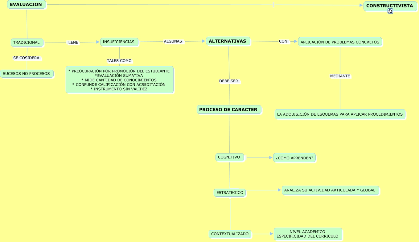 Este Cmap, tiene información relacionada con: EVALUACIÒN, TRADICIONAL TIENE INSUFICIENCIAS, ESTRATEGICO CONTEXTUALIZADO, EVALUACION CONSTRUCTIVISTA, CONTEXTUALIZADO ???? NIVEL ACADEMICO ESPECIFICIDAD DEL CURRICULO, ALTERNATIVAS CON APLICACIÒN DE PROBLEMAS CONCRETOS, INSUFICIENCIAS TALES COMO * PREOCUPACIÒN POR PROMOCIÒN DEL ESTUDIANTE *EVALUACIÒN SUMATIVA * MIDE CANTIDAD DE CONOCIMIENTOS * CONFUNDE CALIFICACIÒN CON ACREDITACIÒN * INSTRUMENTO SIN VALIDEZ, APLICACIÒN DE PROBLEMAS CONCRETOS MEDIANTE LA ADQUISICIÒN DE ESQUEMAS PARA APLICAR PROCEDIMIENTOS, ESTRATEGICO ???? ANALIZA SU ACTIVIDAD ARTICULADA Y GLOBAL, TRADICIONAL SE COSIDERA SUCESOS NO PROCESOS, PROCESO DE CARACTER ESTRATEGICO, ALTERNATIVAS DEBE SER PROCESO DE CARACTER, INSUFICIENCIAS ALGUNAS ALTERNATIVAS, EVALUACION TRADICIONAL, COGNITIVO ¿CÒMO APRENDEN?