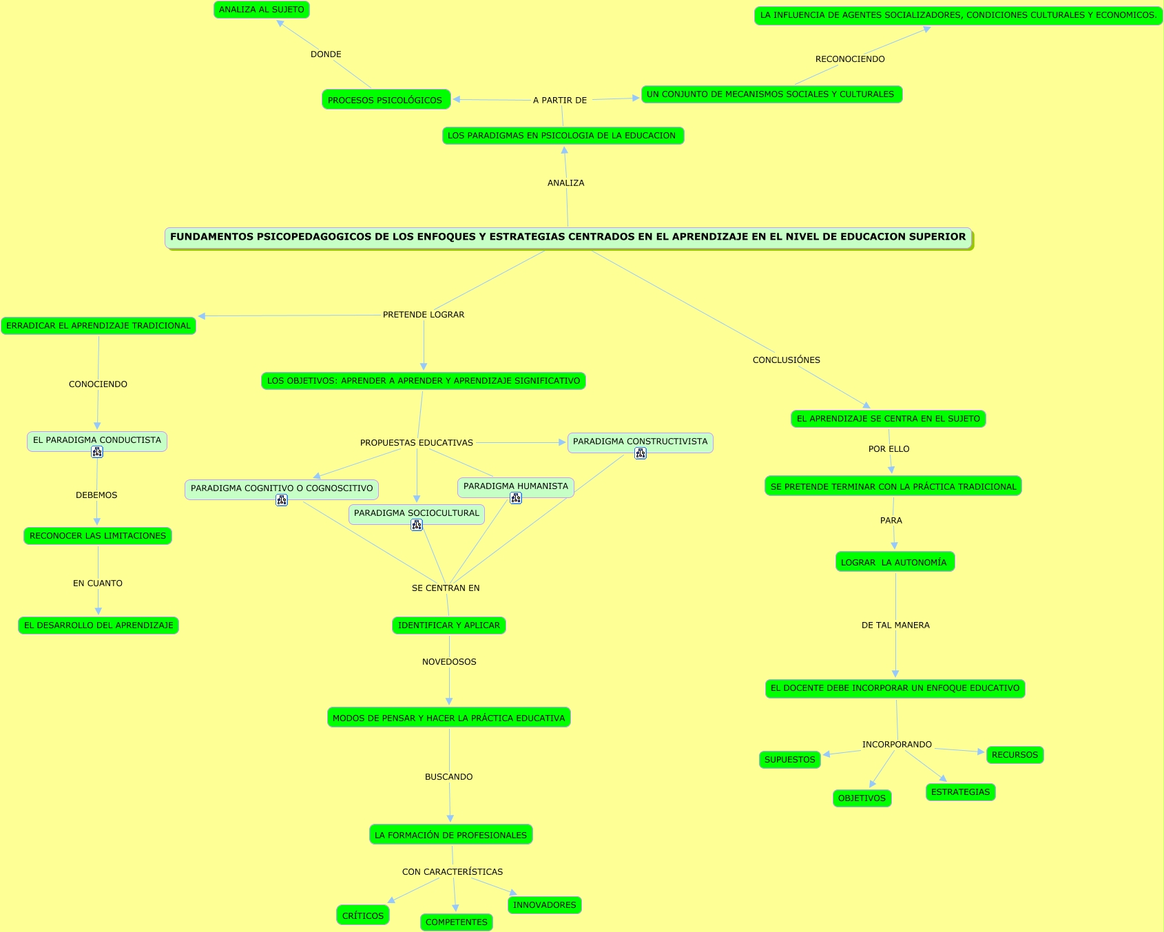 Este Cmap, tiene información relacionada con: ENFOQUES Y MODELOS I, ERRADICAR EL APRENDIZAJE TRADICIONAL CONOCIENDO EL PARADIGMA CONDUCTISTA, IDENTIFICAR Y APLICAR NOVEDOSOS MODOS DE PENSAR Y HACER LA PRÁCTICA EDUCATIVA, EL APRENDIZAJE SE CENTRA EN EL SUJETO POR ELLO SE PRETENDE TERMINAR CON LA PRÁCTICA TRADICIONAL, PARADIGMA SOCIOCULTURAL SE CENTRAN EN IDENTIFICAR Y APLICAR, FUNDAMENTOS PSICOPEDAGOGICOS DE LOS ENFOQUES Y ESTRATEGIAS CENTRADOS EN EL APRENDIZAJE EN EL NIVEL DE EDUCACION SUPERIOR PRETENDE LOGRAR ERRADICAR EL APRENDIZAJE TRADICIONAL, LA FORMACIÓN DE PROFESIONALES CON CARACTERÍSTICAS CRÍTICOS, LA FORMACIÓN DE PROFESIONALES CON CARACTERÍSTICAS COMPETENTES, PARADIGMA CONSTRUCTIVISTA SE CENTRAN EN IDENTIFICAR Y APLICAR, PROCESOS PSICOLÓGICOS DONDE ANALIZA AL SUJETO, LOS OBJETIVOS: APRENDER A APRENDER Y APRENDIZAJE SIGNIFICATIVO PROPUESTAS EDUCATIVAS PARADIGMA CONSTRUCTIVISTA, FUNDAMENTOS PSICOPEDAGOGICOS DE LOS ENFOQUES Y ESTRATEGIAS CENTRADOS EN EL APRENDIZAJE EN EL NIVEL DE EDUCACION SUPERIOR CONCLUSIÓNES EL APRENDIZAJE SE CENTRA EN EL SUJETO, MODOS DE PENSAR Y HACER LA PRÁCTICA EDUCATIVA BUSCANDO LA FORMACIÓN DE PROFESIONALES, UN CONJUNTO DE MECANISMOS SOCIALES Y CULTURALES RECONOCIENDO LA INFLUENCIA DE AGENTES SOCIALIZADORES, CONDICIONES CULTURALES Y ECONOMICOS., EL DOCENTE DEBE INCORPORAR UN ENFOQUE EDUCATIVO INCORPORANDO ESTRATEGIAS, PARADIGMA COGNITIVO O COGNOSCITIVO SE CENTRAN EN IDENTIFICAR Y APLICAR, FUNDAMENTOS PSICOPEDAGOGICOS DE LOS ENFOQUES Y ESTRATEGIAS CENTRADOS EN EL APRENDIZAJE EN EL NIVEL DE EDUCACION SUPERIOR PRETENDE LOGRAR LOS OBJETIVOS: APRENDER A APRENDER Y APRENDIZAJE SIGNIFICATIVO, LOGRAR LA AUTONOMÍA DE TAL MANERA EL DOCENTE DEBE INCORPORAR UN ENFOQUE EDUCATIVO, EL DOCENTE DEBE INCORPORAR UN ENFOQUE EDUCATIVO INCORPORANDO SUPUESTOS, LOS OBJETIVOS: APRENDER A APRENDER Y APRENDIZAJE SIGNIFICATIVO PROPUESTAS EDUCATIVAS PARADIGMA COGNITIVO O COGNOSCITIVO, EL DOCENTE DEBE INCORPORAR UN ENFOQUE EDUCATIVO INCORPORANDO OBJETIVOS
