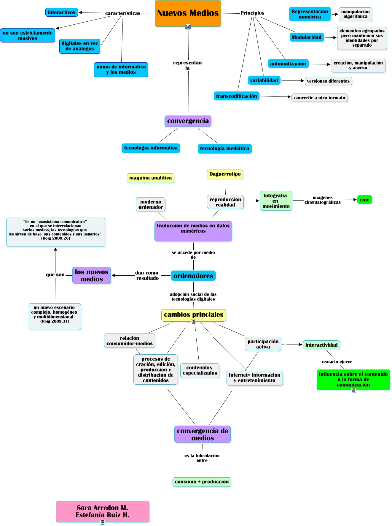 Este Cmap, tiene información relacionada con: nuevos medios, los nuevos medios que son un nuevo escenario complejo, homogéneo y multidimensional. (Roig 2009:31), Modularidad elementos agrupados pero mantienen sus identidades por separado, cambios princiales participación activa, moderno ordenador traducción de medios en datos numéricos, relación consumidor-medios convergencia de medios, Representación numérica ???? manipulación algorítmica, Nuevos Medios Principios automatización, participación activa interactividad, cambios princiales relación consumidor-medios, fotografía en movimiento imágenes cinematográficas cine, Nuevos Medios características unión de informática y los medios, convergencia de medios es la hibridación entre consumo + producción, reproducción realidad traducción de medios en datos numéricos, Nuevos Medios características no son estrictamente masivos, ordenadores dan como resultado los nuevos medios, los nuevos medios que son “Es un “ecosistema comunicativo” en el que se interrelacionan varios medios, las tecnologías que les sirven de base, sus contenidos y sus usuarios”. (Roig 2009:26), reproducción realidad fotografía en movimiento, traducción de medios en datos numéricos se accede por medio de ordenadores, Daguerrotipo reproducción realidad, ordenadores adopción social de las tecnologías digitales cambios princiales