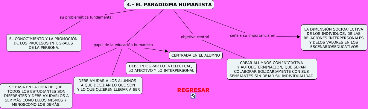 Este Cmap, tiene información relacionada con: PARADIGMA 4, 4.- EL PARADIGMA HUMANISTA objetivo central CREAR ALUMNOS CON INICIATIVA Y AUTODETERMINACIÓN, QUE SEPAN COLABORAR SOLIDARIAMENTE CON SUS SEMEJANTES SIN DEJAR SU INDIVIDUALIDAD., 4.- EL PARADIGMA HUMANISTA papel de la educación humanista DEBE AYUDAR A LOS ALUMNOS A QUE DECIDAN LO QUE SON Y LO QUE QUIEREN LLEGAR A SER, 4.- EL PARADIGMA HUMANISTA su problemática fundamental EL CONOCIMIENTO Y LA PROMOCIÓN DE LOS PROCESOS INTEGRALES DE LA PERSONA., 4.- EL PARADIGMA HUMANISTA papel de la educación humanista CENTRADA EN EL ALUMNO, 4.- EL PARADIGMA HUMANISTA señala su importancia en LA DIMENSIÓN SOCIOAFECTIVA DE LOS INDIVIDUOS, DE LAS RELACIONES INTERPERSONALES Y DELOS VALORES EN LOS ESCENARIOSEDUCATIVOS, 4.- EL PARADIGMA HUMANISTA papel de la educación humanista SE BASA EN LA IDEA DE QUE TODOS LOS ESTUDIANTES SON DIFERENTES Y DEBE AYUDARLOS A SER MÁS COMO ELLOS MISMOS Y MENOSCOMO LOS DEMÁS., 4.- EL PARADIGMA HUMANISTA papel de la educación humanista DEBE INTEGRAR LO INTELECTUAL, LO AFECTIVO Y LO INTERPERSONAL