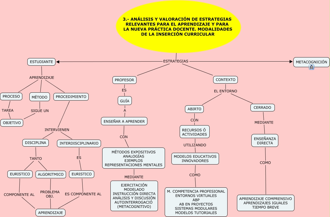 Este Cmap, tiene información relacionada con: A3 ANÁLISIS Y VALORACIÓN, PROCEDIMIENTO INTERVIENEN INTERDISCIPLINARIO, 3.- ANÁLISIS Y VALORACIÓN DE ESTRATEGIAS RELEVANTES PARA EL APRENDIZAJE Y PARA LA NUEVA PRÁCTICA DOCENTE. MODALIDADES DE LA INSERCIÓN CURRICULAR ESTRATEGIAS PROFESOR, DISCIPLINA TANTO EURISTICO, MODELOS EDUCATIVOS INNOVADORES COMO M. COMPETENCIA PROFESIONAL ENTORNOS VIRTUALES ABP AB EN PROYECTOS SISTEMAS MODULARES MODELOS TUTORIALES, 3.- ANÁLISIS Y VALORACIÓN DE ESTRATEGIAS RELEVANTES PARA EL APRENDIZAJE Y PARA LA NUEVA PRÁCTICA DOCENTE. MODALIDADES DE LA INSERCIÓN CURRICULAR ESTRATEGIAS CONTEXTO, 3.- ANÁLISIS Y VALORACIÓN DE ESTRATEGIAS RELEVANTES PARA EL APRENDIZAJE Y PARA LA NUEVA PRÁCTICA DOCENTE. MODALIDADES DE LA INSERCIÓN CURRICULAR ESTRATEGIAS ESTUDIANTE, MÉTODO SIGUE UN OBJETIVO, MÉTODOS EXPOSITIVOS ANALOGÍAS EJEMPLOS REPRESENTACIONES MENTALES MEDIANTE EJERCITACIÓN MODELADO INSTRUCCIÓN DIRECTA ANÁLISIS Y DISCUSIÓN AUTOINTERROGACIÓ (METACOGNITIVO), EURISTICO ES COMPONENTE AL APRENDIZAJE, ENSEÑANZA DIRECTA COMO APRENDIZAJE COMPRENSIVO APRENDIZAJES IGUALES TIEMPO BREVE, RECURSOS Ó ACTIVIDADES UTILIZANDO MODELOS EDUCATIVOS INNOVADORES, ABIRTO CON RECURSOS Ó ACTIVIDADES, ESTUDIANTE APRENDIZAJE PROCEDIMIENTO, 3.- ANÁLISIS Y VALORACIÓN DE ESTRATEGIAS RELEVANTES PARA EL APRENDIZAJE Y PARA LA NUEVA PRÁCTICA DOCENTE. MODALIDADES DE LA INSERCIÓN CURRICULAR ESTRATEGIAS METACOGNICIÓN, CONTEXTO EL ENTORNO ABIRTO, CERRADO MEDIANTE ENSEÑANZA DIRECTA, ESTUDIANTE APRENDIZAJE PROCESO, CONTEXTO EL ENTORNO CERRADO, INTERDISCIPLINARIO ES EURISTICO, ENSEÑAR A APRENDER CON MÉTODOS EXPOSITIVOS ANALOGÍAS EJEMPLOS REPRESENTACIONES MENTALES