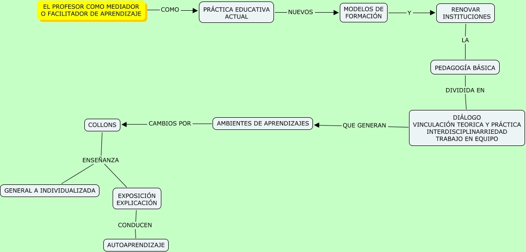 Este Cmap, tiene información relacionada con: B4 EL PROFESOR COMO MEDIADOR O FACILITADOR, COLLONS ENSEÑANZA EXPOSICIÓN EXPLICACIÓN, EL PROFESOR COMO MEDIADOR O FACILITADOR DE APRENDIZAJE COMO PRÁCTICA EDUCATIVA ACTUAL, RENOVAR INSTITUCIONES LA PEDAGOGÍA BÁSICA, AMBIENTES DE APRENDIZAJES CAMBIOS POR COLLONS, PRÁCTICA EDUCATIVA ACTUAL NUEVOS MODELOS DE FORMACIÓN, MODELOS DE FORMACIÓN Y RENOVAR INSTITUCIONES, COLLONS ENSEÑANZA GENERAL A INDIVIDUALIZADA, DIÁLOGO VINCULACIÓN TEORICA Y PRÁCTICA INTERDISCIPLINARRIEDAD TRABAJO EN EQUIPO QUE GENERAN AMBIENTES DE APRENDIZAJES, EXPOSICIÓN EXPLICACIÓN CONDUCEN AUTOAPRENDIZAJE, PEDAGOGÍA BÁSICA DIVIDIDA EN DIÁLOGO VINCULACIÓN TEORICA Y PRÁCTICA INTERDISCIPLINARRIEDAD TRABAJO EN EQUIPO