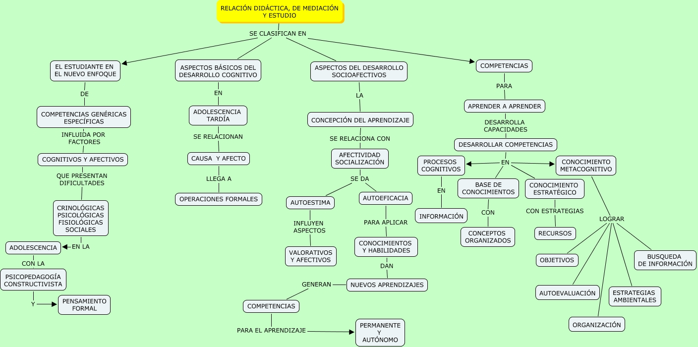 Este Cmap, tiene información relacionada con: B2 RELACION DIDÁCTICA, MEDIACIÓN Y ESTUDIO, PROCESOS COGNITIVOS EN INFORMACIÓN, CONOCIMIENTO METACOGNITIVO LOGRAR ORGANIZACIÓN, APRENDER A APRENDER DESARROLLA CAPACIDADES DESARROLLAR COMPETENCIAS, RELACIÓN DIDÁCTICA, DE MEDIACIÓN Y ESTUDIO SE CLASIFICAN EN ASPECTOS BÁSICOS DEL DESARROLLO COGNITIVO, CONCEPCIÓN DEL APRENDIZAJE SE RELACIONA CON AFECTIVIDAD SOCIALIZACIÓN, CONOCIMIENTO METACOGNITIVO LOGRAR AUTOEVALUACIÓN, AFECTIVIDAD SOCIALIZACIÓN SE DA AUTOEFICACIA, PSICOPEDAGOGÍA CONSTRUCTIVISTA Y PENSAMIENTO FORMAL, BASE DE CONOCIMIENTOS CON CONCEPTOS ORGANIZADOS, DESARROLLAR COMPETENCIAS EN CONOCIMIENTO METACOGNITIVO, NUEVOS APRENDIZAJES GENERAN COMPETENCIAS, RELACIÓN DIDÁCTICA, DE MEDIACIÓN Y ESTUDIO SE CLASIFICAN EN COMPETENCIAS, CAUSA Y AFECTO LLEGA A OPERACIONES FORMALES, COMPETENCIAS PARA APRENDER A APRENDER, ASPECTOS BÁSICOS DEL DESARROLLO COGNITIVO EN ADOLESCENCIA TARDÍA, CONOCIMIENTOS Y HABILIDADES DAN NUEVOS APRENDIZAJES, CRINOLÓGICAS PSICOLÓGICAS FISIOLÓGICAS SOCIALES EN LA ADOLESCENCIA, COMPETENCIAS PARA EL APRENDIZAJE PERMANENTE Y AUTÓNOMO, CONOCIMIENTO METACOGNITIVO LOGRAR ESTRATEGIAS AMBIENTALES, CONOCIMIENTO METACOGNITIVO LOGRAR BUSQUEDA DE INFORMACIÓN