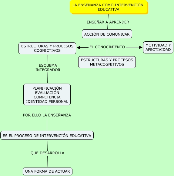 Este Cmap, tiene información relacionada con: B3 LA ENSEÑANZA COMO INTERVENCIÓN EDUCATIVA, ACCIÓN DE COMUNICAR EL CONOCIMIENTO ESTRUCTURAS Y PROCESOS METACOGNITIVOS, ES EL PROCESO DE INTERVENCIÓN EDUCATIVA QUE DESARROLLA UNA FORMA DE ACTUAR, PLANIFICACIÓN EVALUACIÓN COMPETENCIA IDENTIDAD PERSONAL POR ELLO LA ENSEÑANZA ES EL PROCESO DE INTERVENCIÓN EDUCATIVA, LA ENSEÑANZA COMO INTERVENCIÓN EDUCATIVA ENSEÑAR A APRENDER ACCIÓN DE COMUNICAR, ESTRUCTURAS Y PROCESOS COGNICTIVOS ESQUEMA INTEGRADOR PLANIFICACIÓN EVALUACIÓN COMPETENCIA IDENTIDAD PERSONAL, ACCIÓN DE COMUNICAR EL CONOCIMIENTO MOTIVIDAD Y AFECTIVIDAD, ACCIÓN DE COMUNICAR EL CONOCIMIENTO ESTRUCTURAS Y PROCESOS COGNICTIVOS