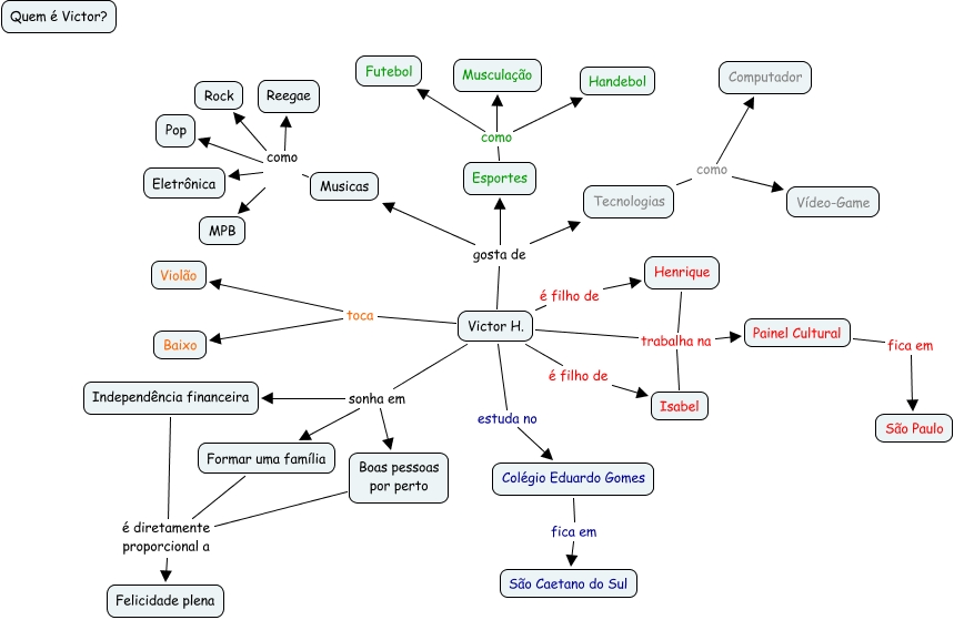 Esse mapa conceitual, produzido no IHMC CmapTools, tem a informação relacionada a: Victor Henrique nº28, Musicas como Eletrônica, Victor H. é filho de Henrique, Musicas como MPB, Victor H. sonha em Boas pessoas por perto, Tecnologias como Computador, Esportes como Handebol, Victor H. é filho de Isabel, Musicas como Rock, Victor H. gosta de Esportes, Independência financeira é diretamente proporcional a Felicidade plena, Esportes como Futebol, Formar uma família é diretamente proporcional a Felicidade plena, Victor H. toca Violão, Painel Cultural fica em São Paulo, Colégio Eduardo Gomes fica em São Caetano do Sul, Henrique trabalha na Painel Cultural, Victor H. estuda no Colégio Eduardo Gomes, Esportes como Musculação, Victor H. sonha em Formar uma família, Boas pessoas por perto é diretamente proporcional a Felicidade plena
