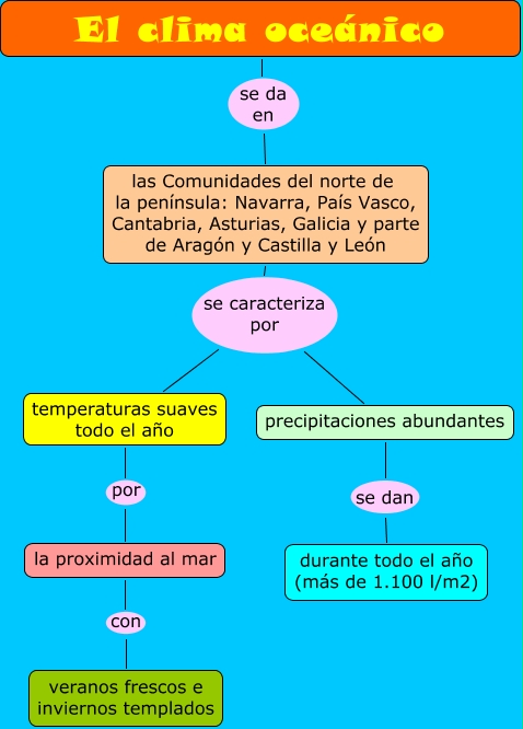 Este Cmap, tiene información relacionada con: El clima oceánico, El clima oceánico se da en las Comunidades del norte de la península: Navarra, País Vasco, Cantabria, Asturias, Galicia y parte de Aragón y Castilla y León, precipitaciones abundantes se dan durante todo el año (más de 1.100 l/m2), temperaturas suaves todo el año por la proximidad al mar, la proximidad al mar con veranos frescos e inviernos templados, las Comunidades del norte de la península: Navarra, País Vasco, Cantabria, Asturias, Galicia y parte de Aragón y Castilla y León se caracteriza por precipitaciones abundantes, las Comunidades del norte de la península: Navarra, País Vasco, Cantabria, Asturias, Galicia y parte de Aragón y Castilla y León se caracteriza por temperaturas suaves todo el año